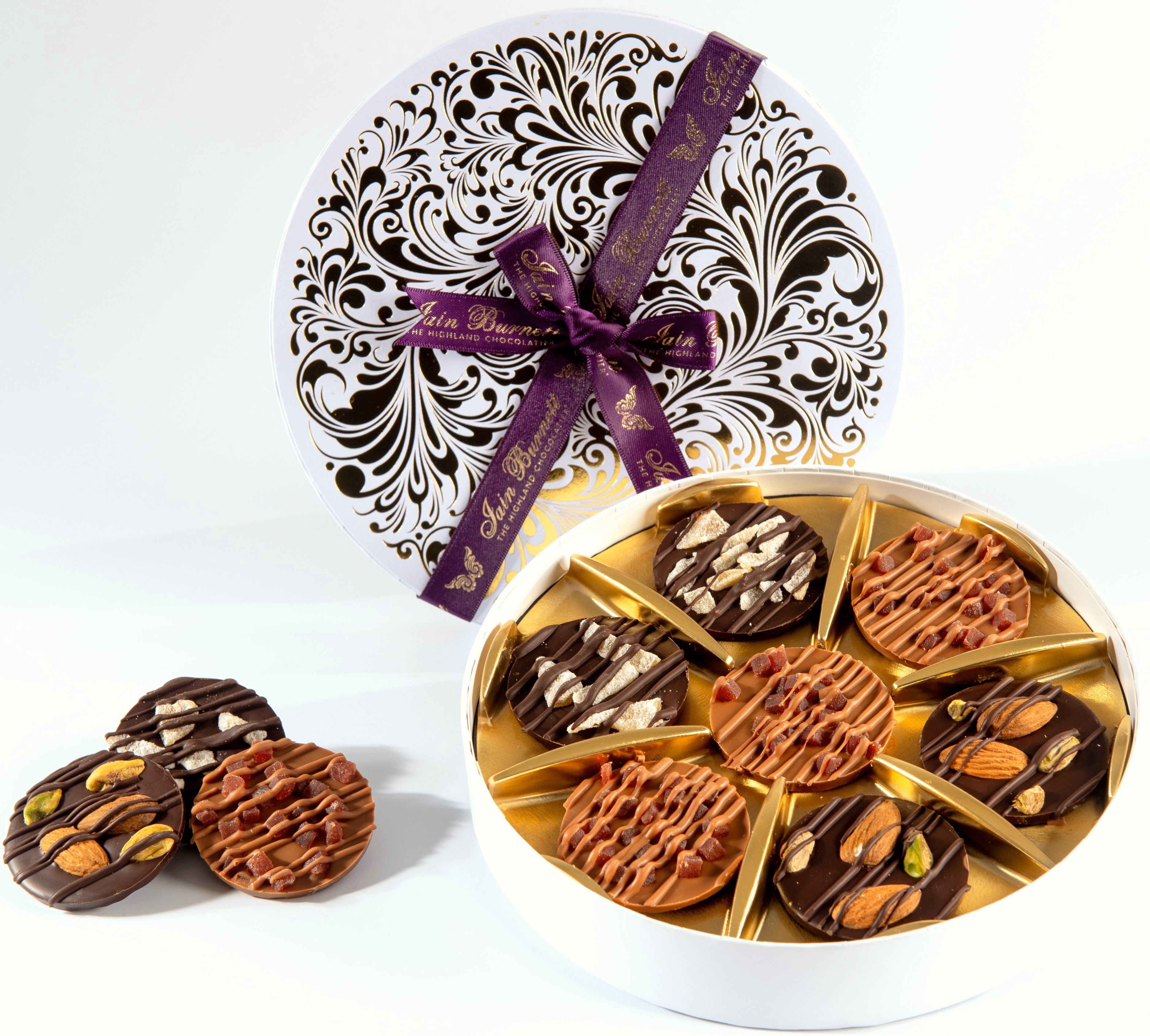A mixed selection of 14 chocolate Florentine disks. Couverture milk chocolate with natural notes of caramel, scattered with tangy strawberry pieces and dark São Tomé single origin chocolate studded with whole almonds and pistachios, or fiery Chinese root ginger.