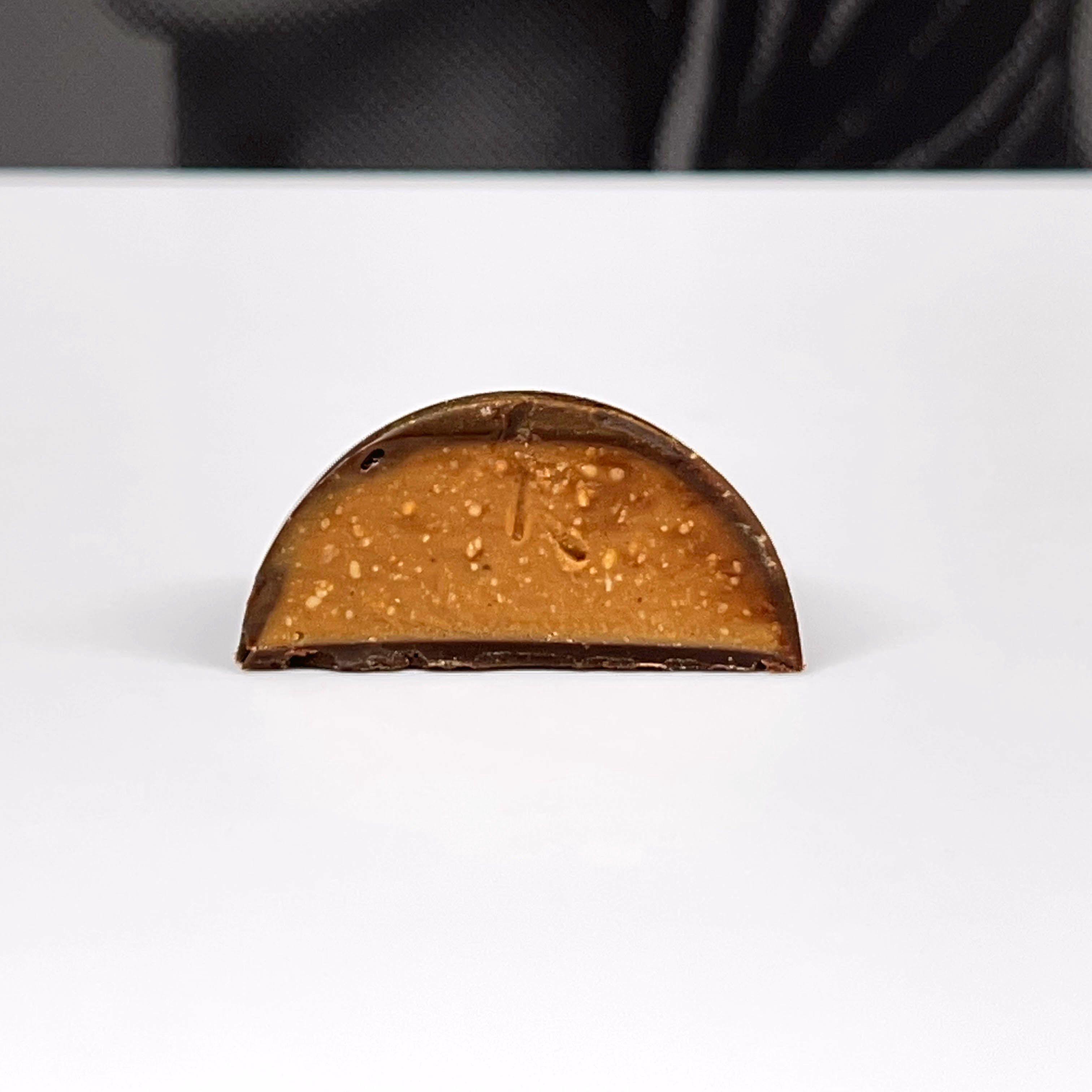A rich milk chocolate hazelnut gianduja encased in a dark chocolate with a pinch of sea salt. These chocolate are seriously addictive.