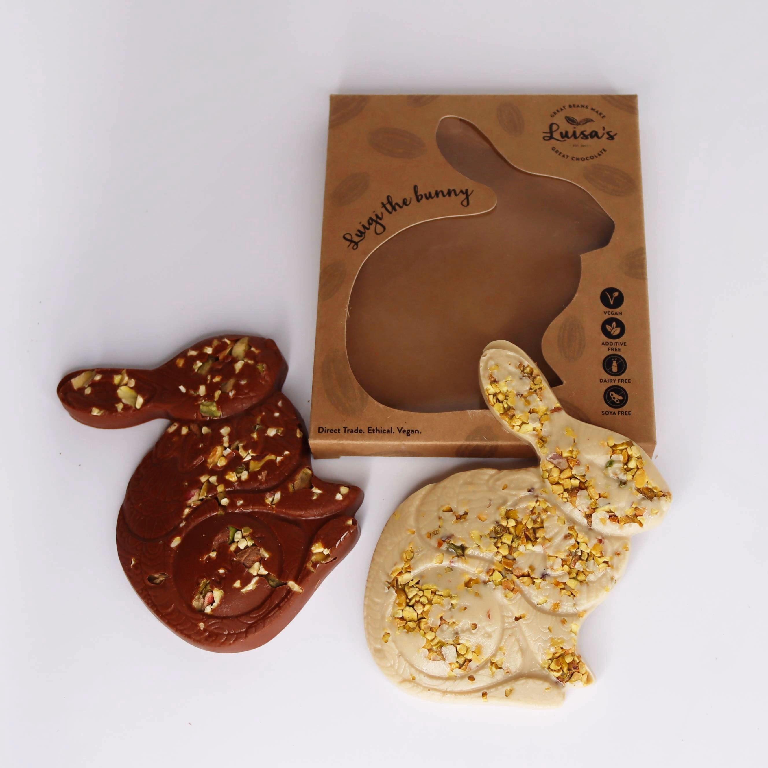 1 × Pistachio & Casholate Luigi the Bunny – our creamy, plant-based alternative to milk chocolate with perfectly roasted pistachios