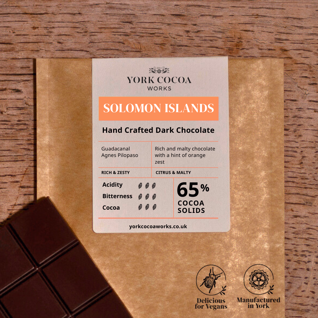 Our 65% Solomon Islands Dark Chocolate is full of citrus and malty notes, hand crafted at our Chocolate Manufactory York Cocoa Works using cocoa beans sourced from Guadacanal in the Solomon Islands.