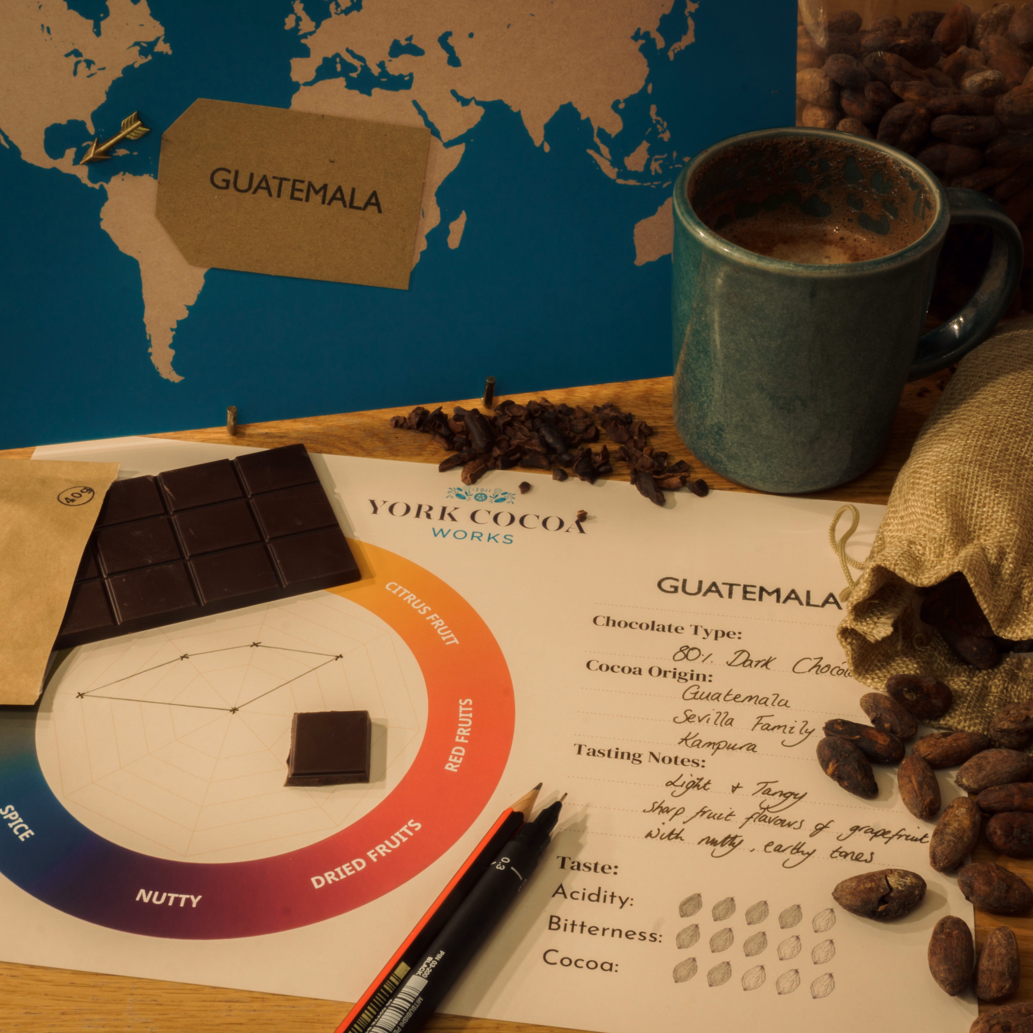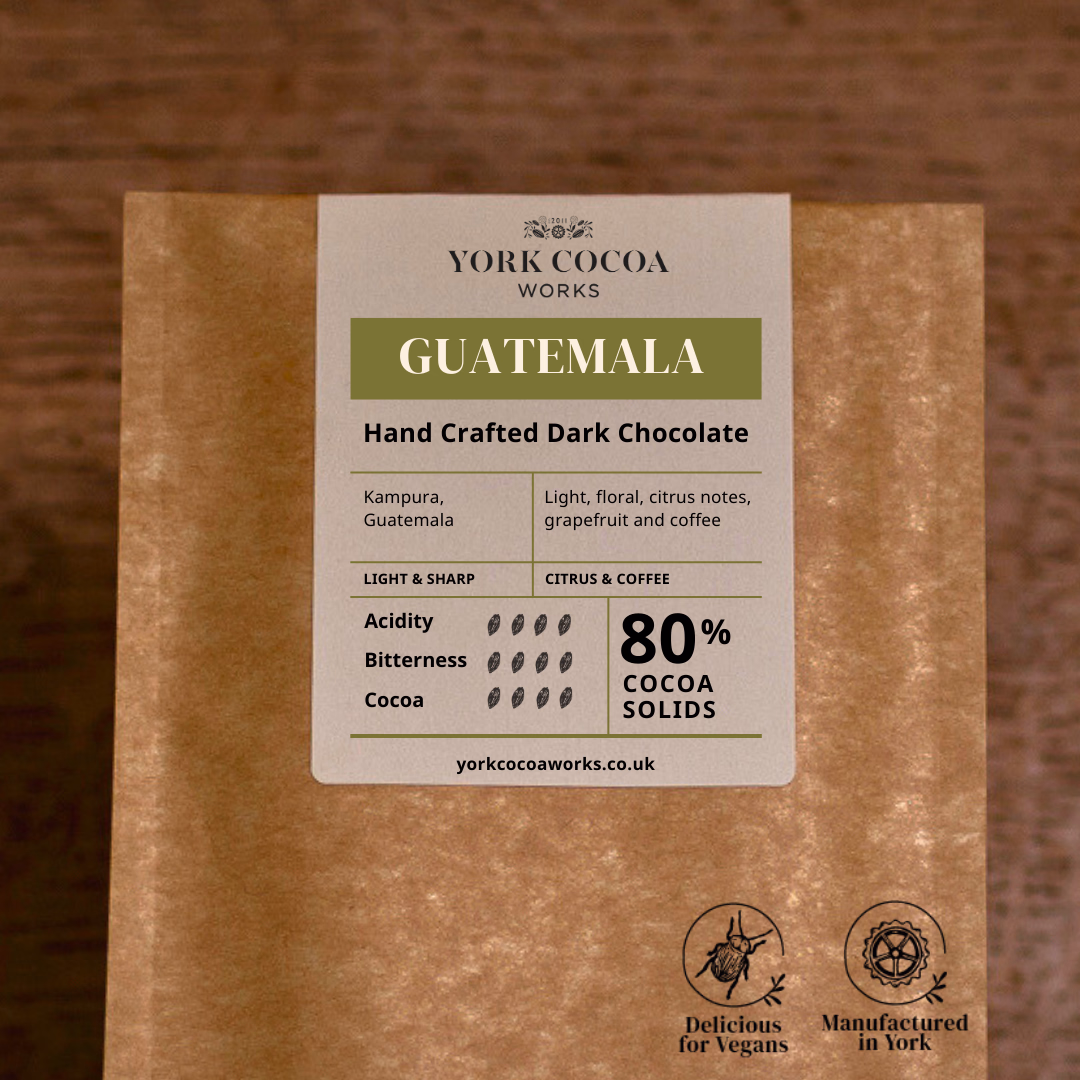 Our 80% Guatemala Dark Chocolate is a Dark and Bitter chocolate with zesty fruity and coffee tones, hand crafted at our Chocolate Manufactory York Cocoa Works using cocoa beans sourced from the Kampura region of Guatemala together with cocoa butter and British grown sugar to create a dark chocolate hit.