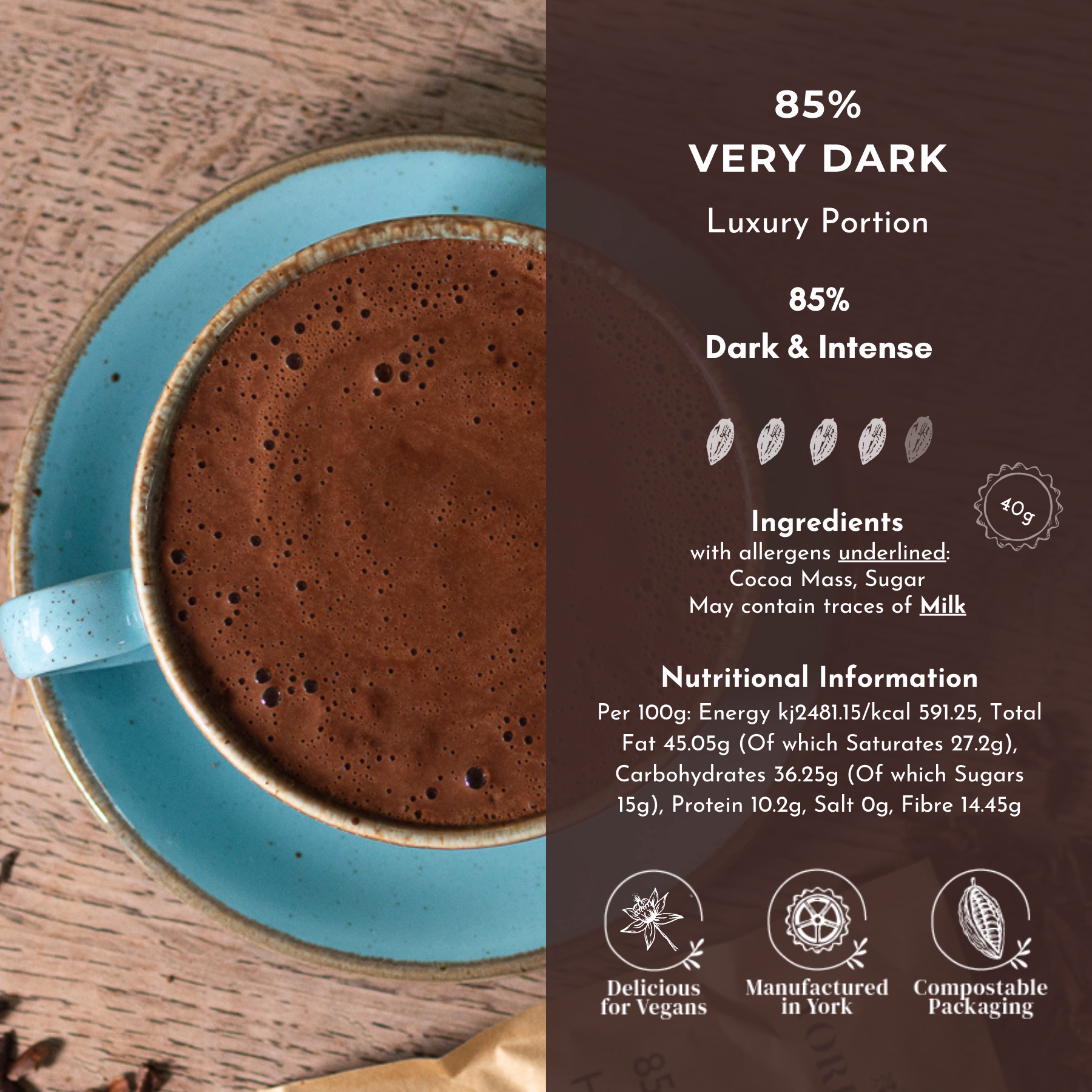 Our Very Dark Hot Chocolate is a strong 85% chocolate blend which has been hand crafted at our Chocolate Manufactory, York Cocoa Works.