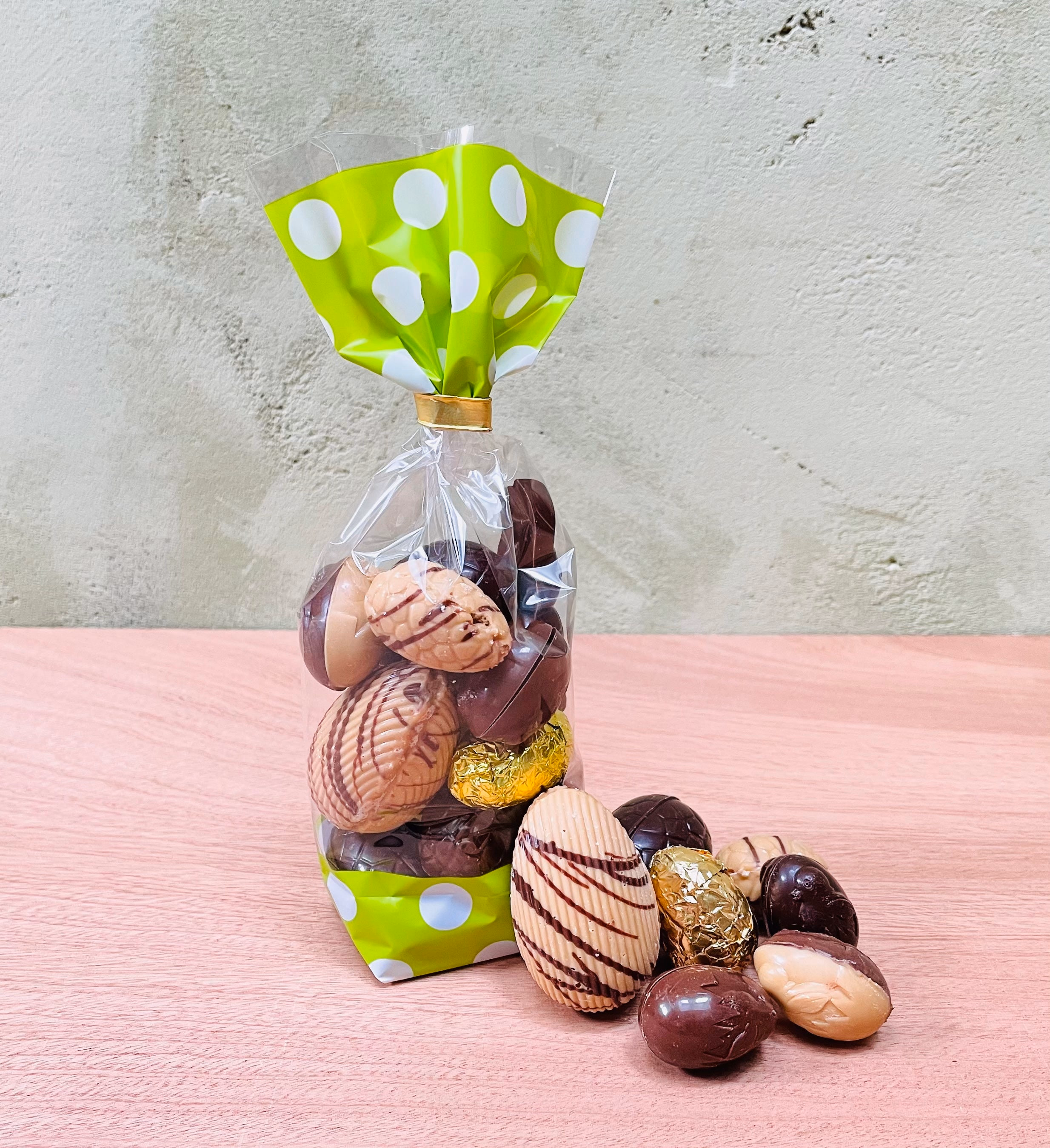 Artisan selection mixed bag Easter eggs, some of our house chocolate hollow mini eggs and a selection of eggs filled with Salted Caramel, Vanilla caramel Gold Crispy eggs, Solid White & Caramel chocolate, Solid milk & Caramel chocolate & a wee solid Easter Bunny.