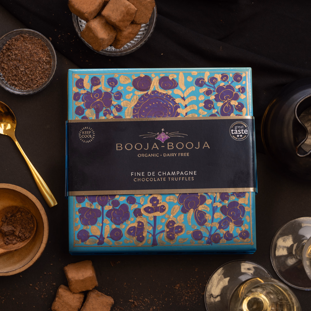 A beautiful gift box hand painted by talented artists in Kashmir, India, using traditional art forms. Perfect for those who love delicious chocolate and beautiful things. Contains 16 melt-in-the-mouth chocolate truffles, inebriated with organic Fine de Champagne. 185g.