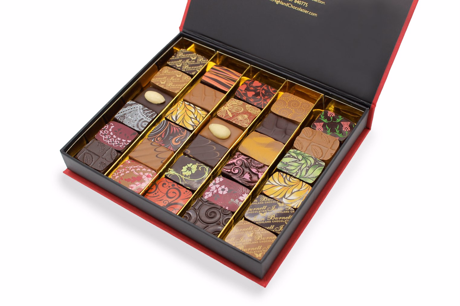 A curated collection of Iain Burnett's Award Winning Velvet Truffles and Pralines. Each piece has been "enrobed" or delicately covered in a paper thin layer of either Iain's signature São Tomé single origin dark chocolate, or couverture milk chocolate with natural notes of caramel before being decorated with a colourful cocoa-butter design.
