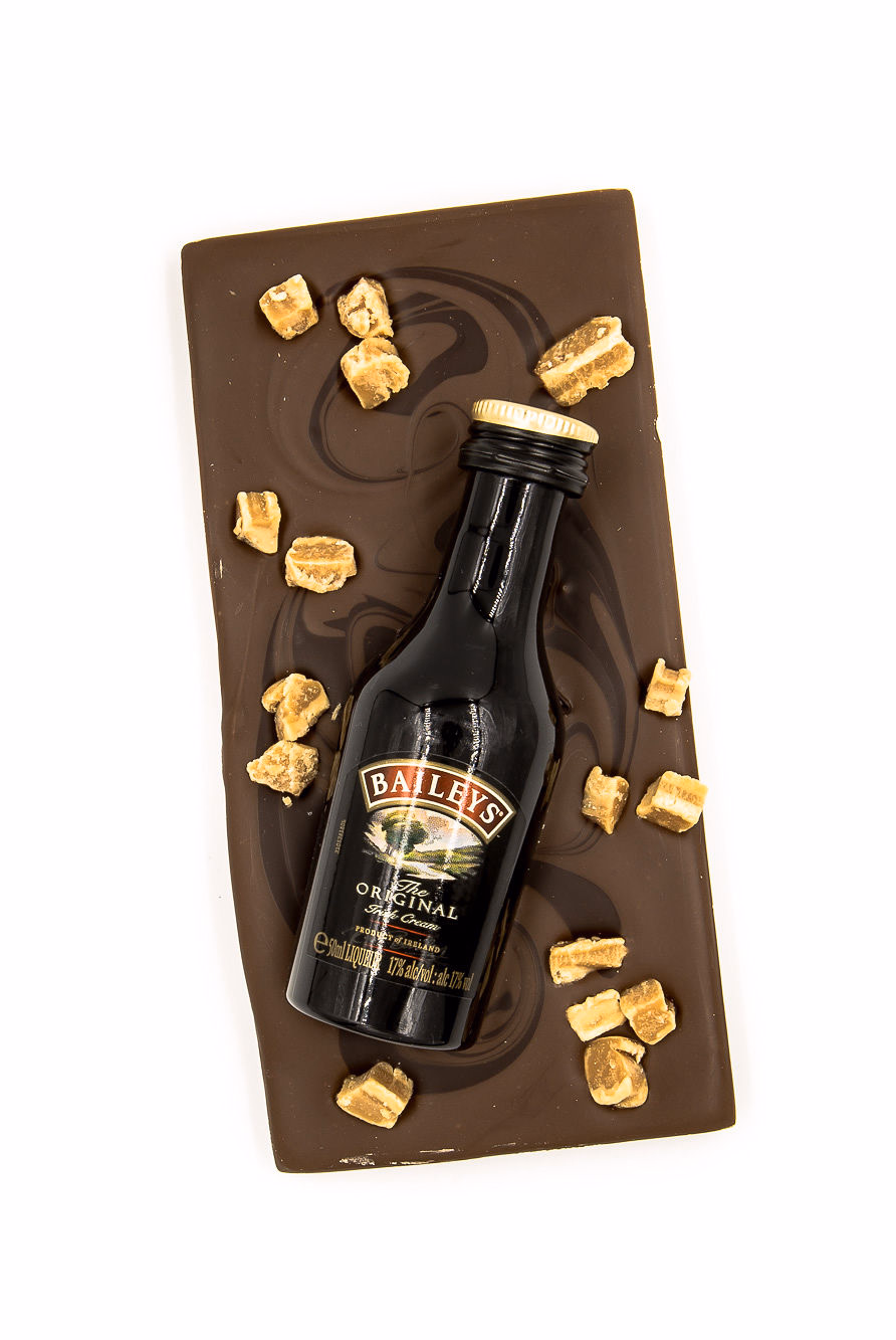 A Baileys Irish Whiskey Cream Liqueur miniature 5cl bottle set in a smooth milk and dark chocolate swirl bar generously sprinkled with creamy fudge pieces.