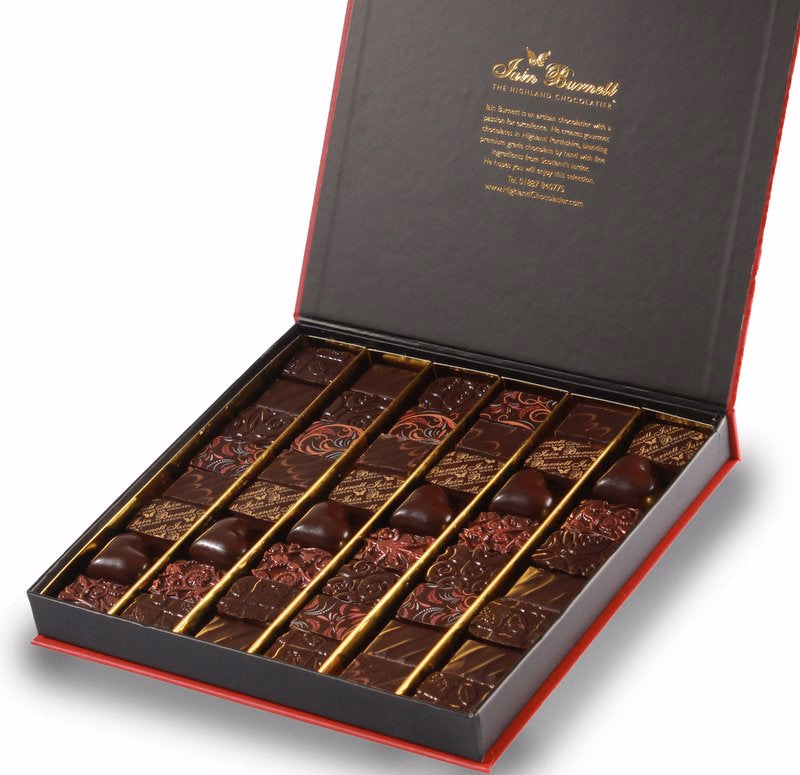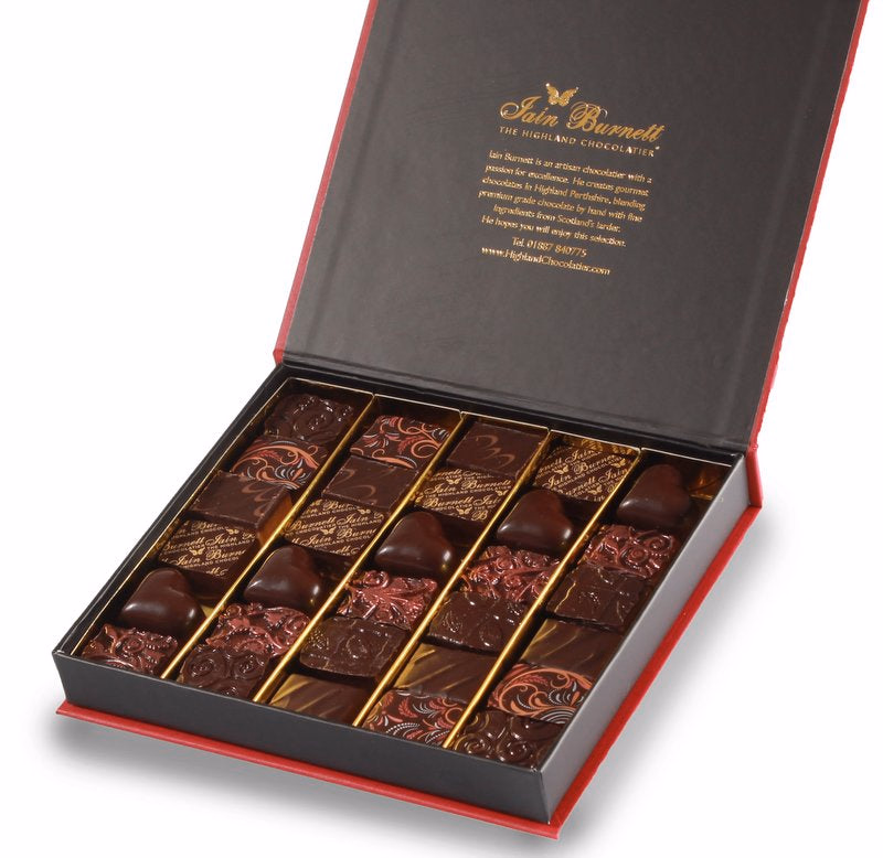 An enchanting mix of of Iain Burnett's award-winning chocolates, including limited edition Dark Sea Salted Hearts, the World Gold Winning Dark Velvet Truffle and the World's First Ruby Velvet Truffle. Also includes crunchy Cacao Nibs, smooth Dark Pralines, the Orange & Clove Velvet Truffle, Ginger Velvet Truffles and Espresso Velvet Truffles.