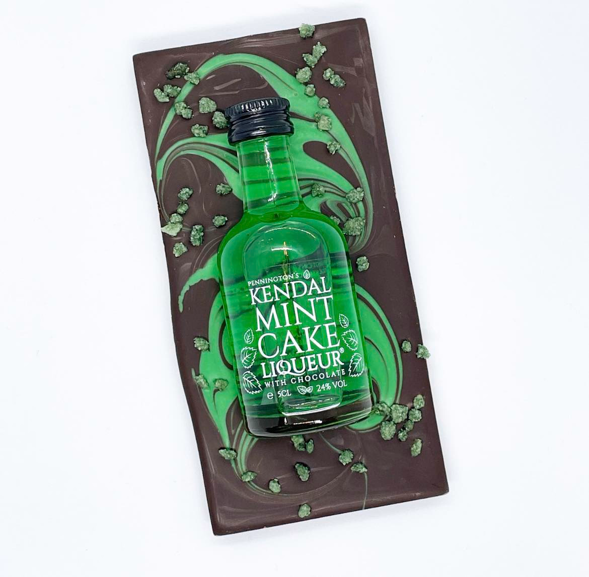 A Kendal Mint Cake Liqueur miniature 5cl bottle set in a rich dark chocolate swirl bar sprinkled with sugared mint crystals. These novel bars make a fun gift for any mint cake lover.
