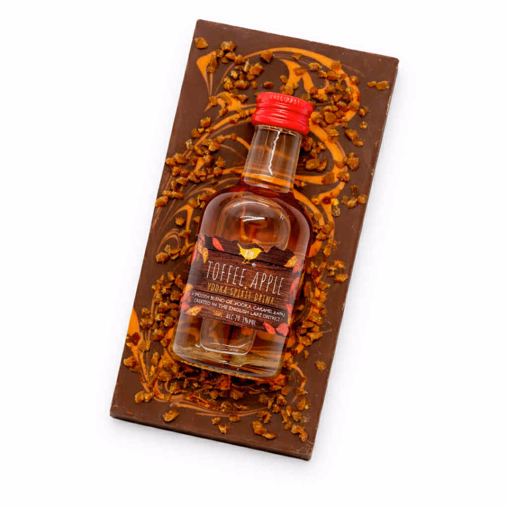 Kin Toffee Apple Vodka miniature 5cl bottle set in a smooth milk chocolate swirl bar sprinkled with caramel shards. These novel bars make a fun gift for any toffee vodka fans.