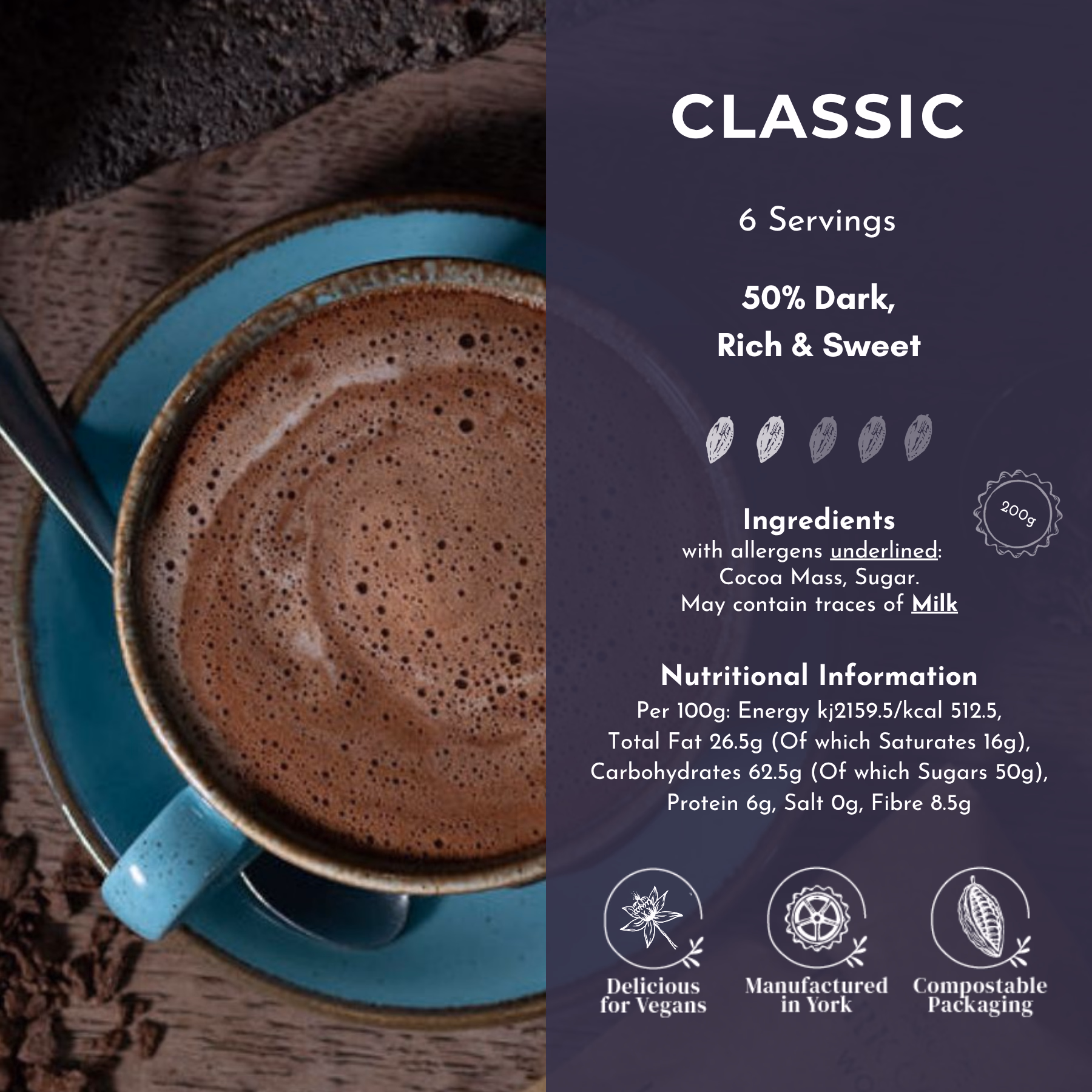 Indulge in our Classic Dark Hot Chocolate flakes, expertly handcrafted at York Cocoa Works. Made from our signature blend of cocoa beans combined with just the right amount of sugar, these flakes create a rich, smooth chocolate base. Enjoy it with water, your preferred milk, or for a luxurious twist, recreate a decadent Georgian tradition by adding hot red wine.