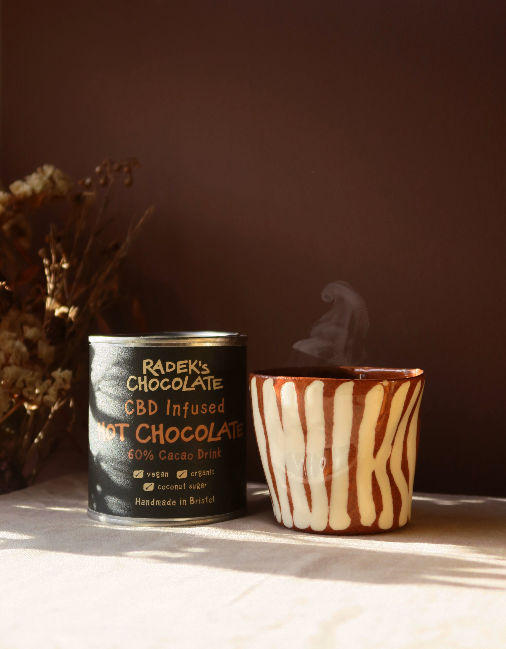 This CBD drinking chocolate (hot chocolate) is made with ethically sourced cocoa beans grown by farmers respecting human rights, biodiversity and cocoa forestry. Our chocolate is made in micro batches which are stone-ground for three days, blending our specially sourced cacao with cbd oil, coconut sugar, cocoa butter, lucuma, and vanilla.