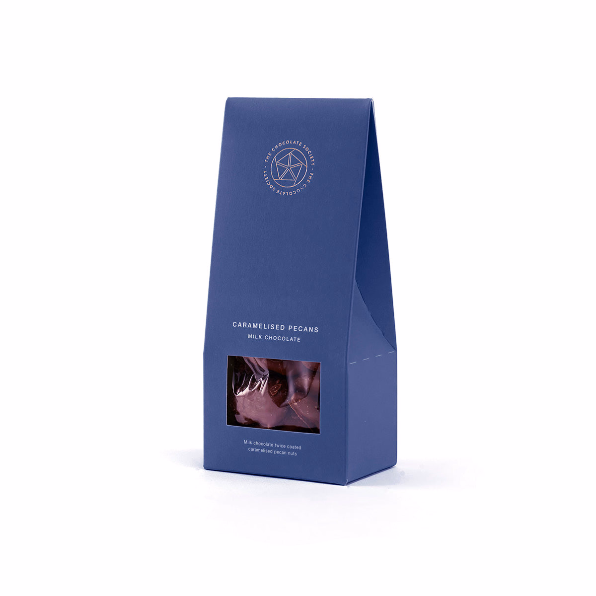 Due to the beautifully textured surface of the pecan, when caramelised, the molten caramel floods the grooves and dips, hugging every contour of the nut, creating a wonderfully unpredictable depth to the caramel layer and a deliciously variable crunch. Our caramelised pecan is then enrobed in a double layer of our house blend of Colombian milk chocolate for that ultra-smooth, final flourish.