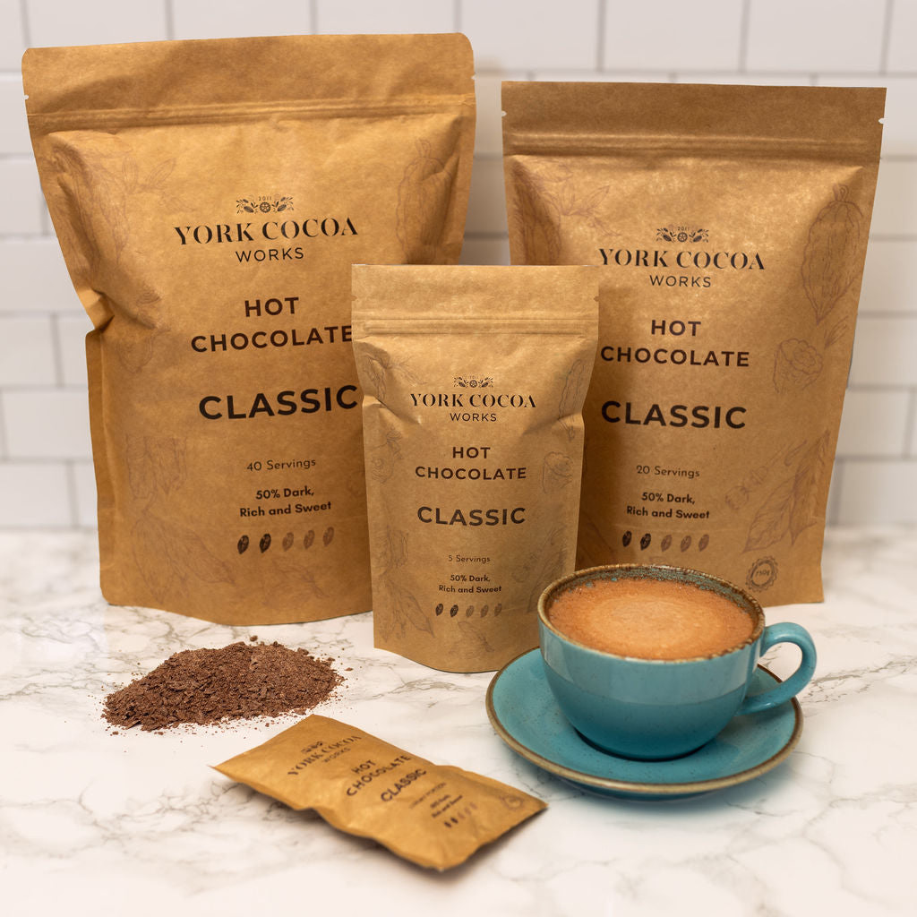 Indulge in our Classic Dark Hot Chocolate flakes, expertly handcrafted at York Cocoa Works. Made from our signature blend of cocoa beans combined with just the right amount of sugar, these flakes create a rich, smooth chocolate base. Enjoy it with water, your preferred milk, or for a luxurious twist, recreate a decadent Georgian tradition by adding hot red wine.