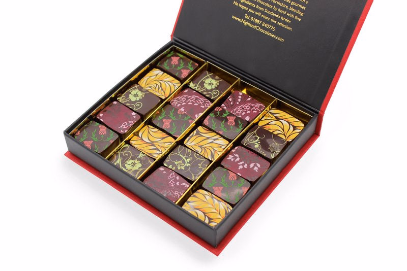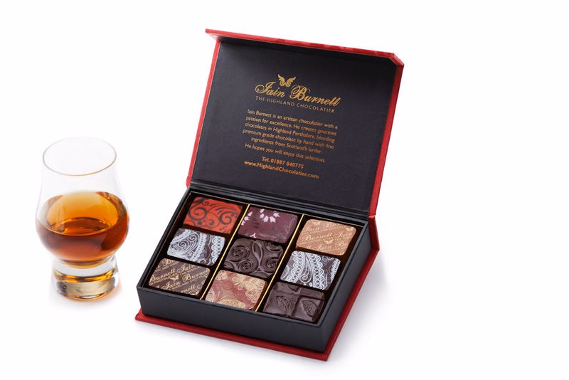 A selection of Velvet Truffles and Pralines expertly chosen by Iain Burnett to pair perfectly with the following single malt whiskies from across Scotland: Bunnahabhain 12 Year Old, Cragganmore 12 Year Old, Caol Ila 12 Year Old, Dalwhinnie 15 Year Old, Glenfiddich 12 Year Old, Glenkinchie 12 Year Old, Lagavulin 16 Year old, Oban 14 Year Old and Talisker 10 Year Old. This selection makes a unique gift, perfect for whisky lovers! Complete with pairing notes.