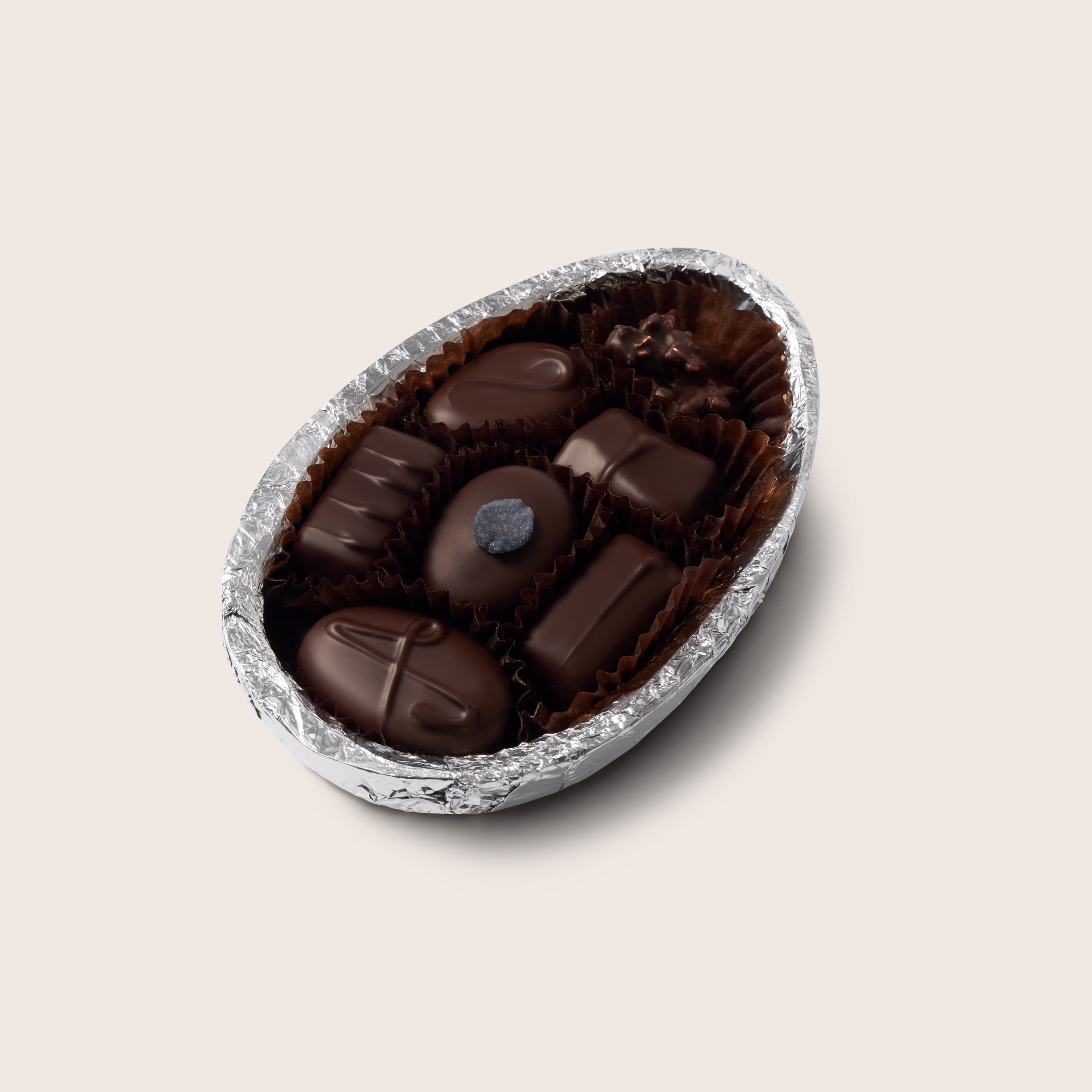 Our Dark Chocolate Easter Egg, filled with a selection of our bestselling handmade dark chocolates, made using Valrhona 62% chocolate, inside the egg.