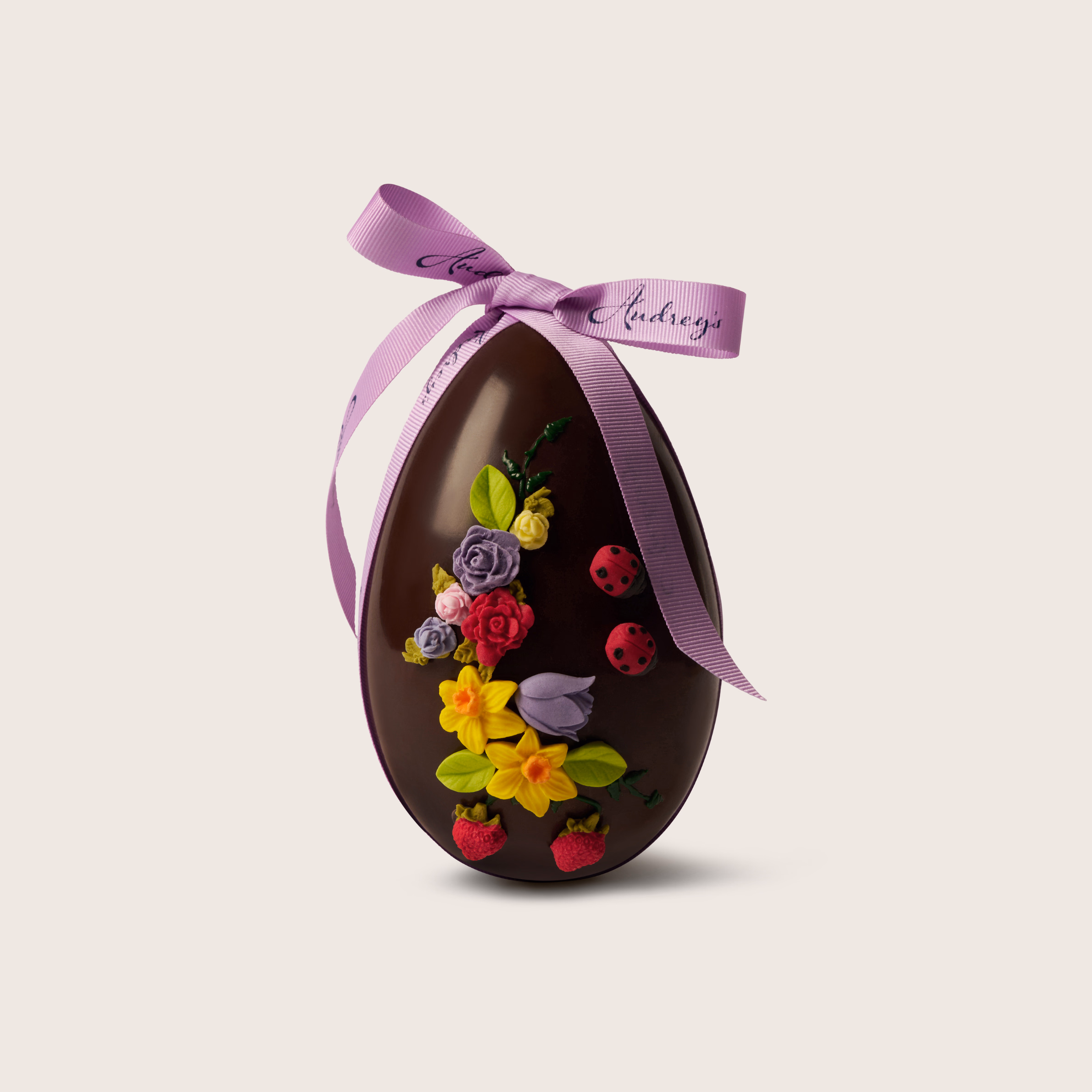 An intricately decorated dark chocolate egg, all made and decorated by hand in our Sussex factory using 62% Valrhona chocolate.