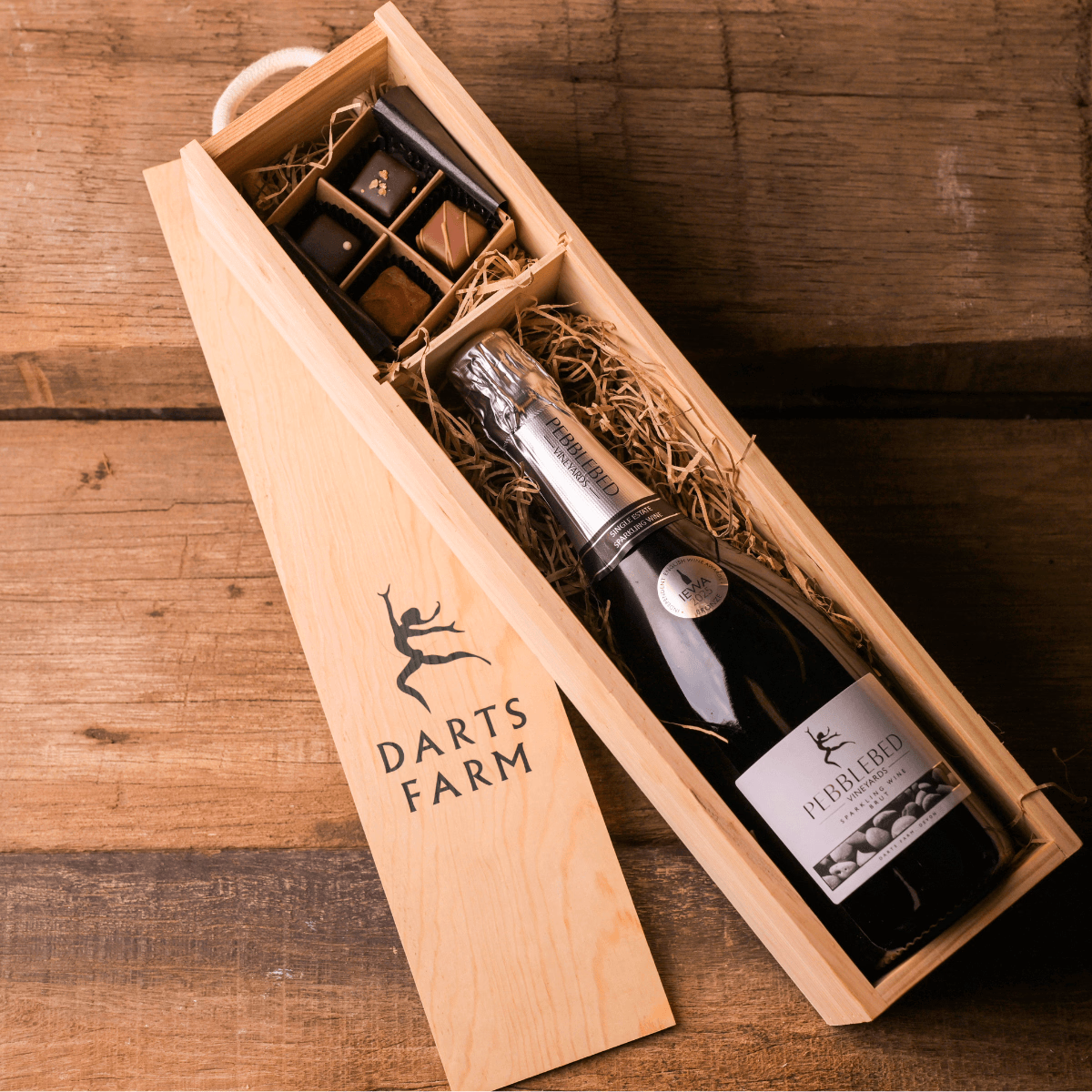 Handcrafted, artisan truffles from our chocolatiers, Cow & Cacao, paired with Sparkling White Wine from our Pebblebed Vineyard on our farm. Gifted in a beautiful branded wooden box.