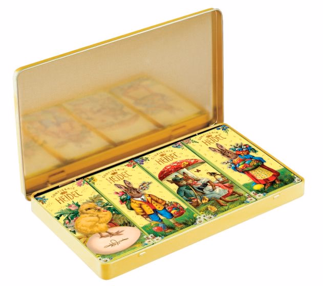 Traditional Easter Rabbit tin containing 4 beautifully presented milk chocolate bars. Great alternative to a Easter Egg with a keep sake tin