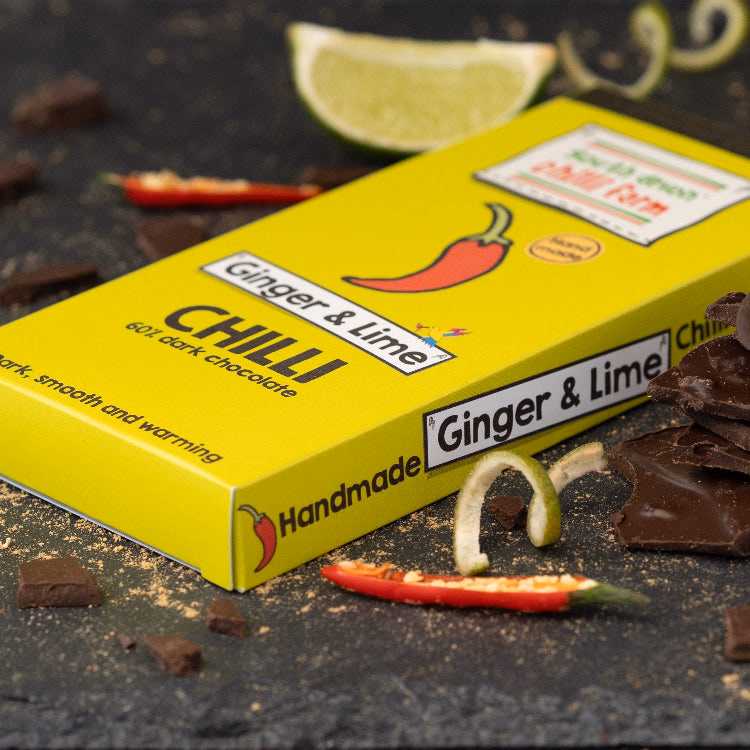 Ginger & Lime Chilli Chocolate blends chewy, zingy pieces of crystallized stem ginger and the citrusy notes of natural lime with our home-grown chilli heat.