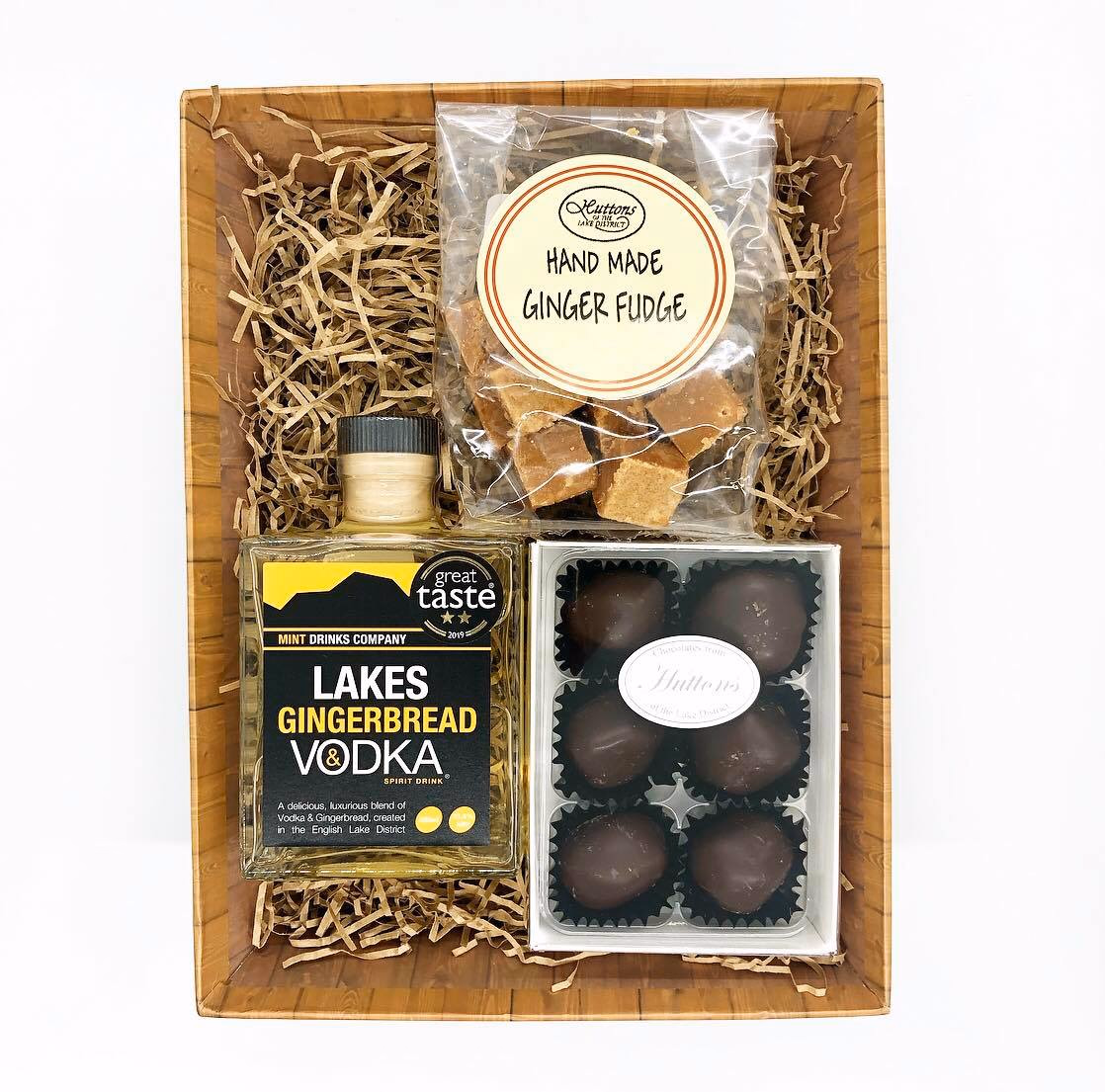 This delicious sweet and spicy hamper contains a bottle of the extremely moreish Lakes Gingerbread & Vodka, six hand dipped stem ginger pieces in dark chocolate and spicy ginger fudge handmade by Romneys of Kendal