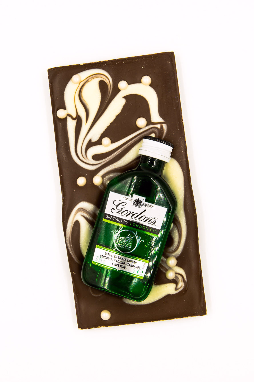 A Gordons London’s dry gin miniature 5cl bottle set in a smooth milk and white chocolate swirl bar sprinkled with sugar pearls. These novel bars make a fun gift, gin and chocolate- what’s not to love?