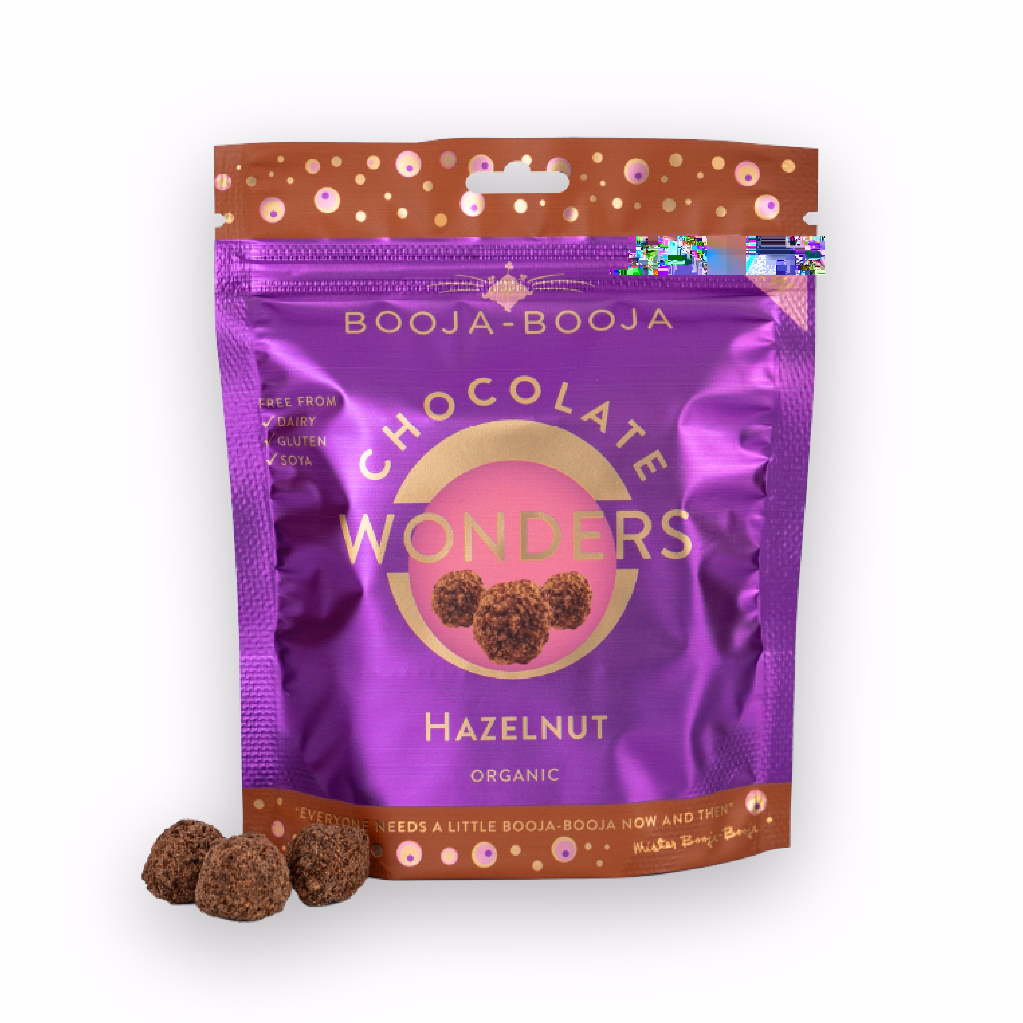 Amazingly delicious little chocolate adventures. Melt-in-the-mouth chocolate hazelnut ganache rolled in rich chocolate flakes. Like all Booja-Booja Chocolate Wonders, these irresistible bite-sized treats are dairy free, gluten free and vegan. 65g.