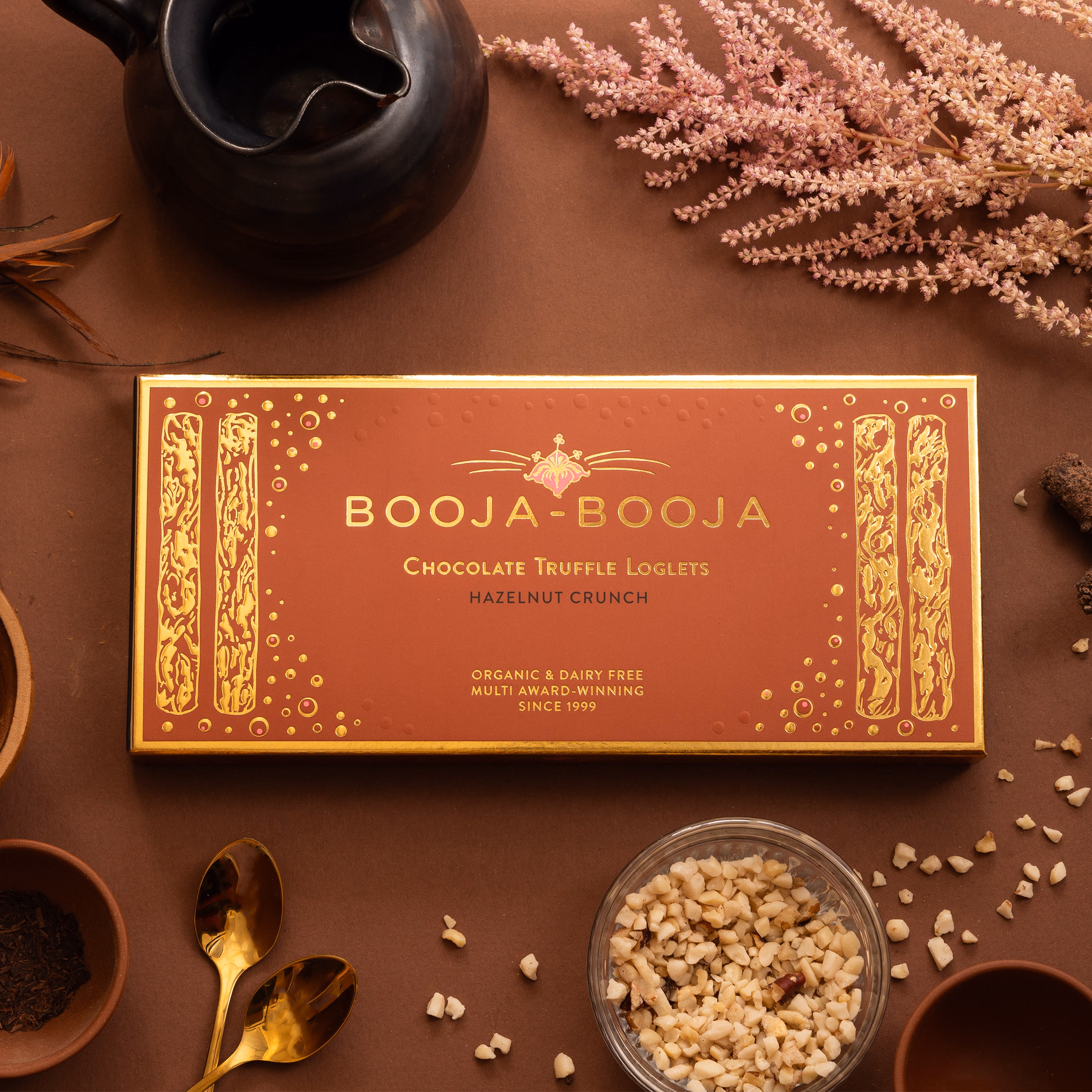 Ten especially long melt-in-the-mouth chocolate truffle loglets rolled in rich chocolate flakes. Perfect for elegant nibbling. Sweetly roasted hazelnut chocolate truffle delights. 115g.