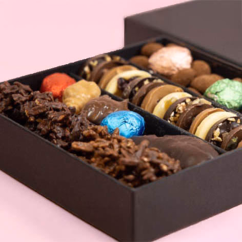 Whilst the images are a representation we will create delicious assortments depending on the production period, but rest assure we have an eye for detail and presentation of our chocolates is also at the forefront of what we do. These sections are packaged in a lovely black rigid box with a secure sleeve.