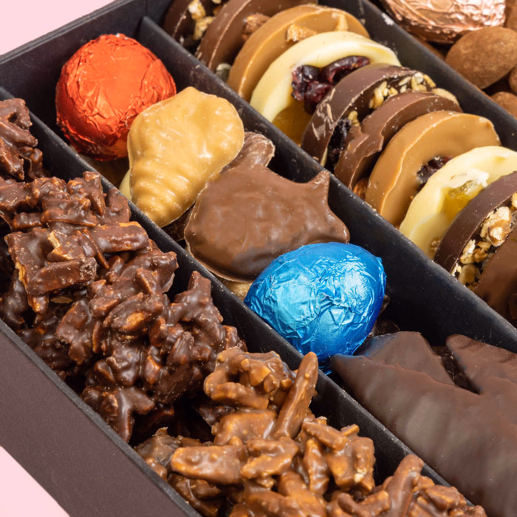 We have included a wonderful selection of our mini Easter filled eggs, decorated chocolates, almonds rocks, chocolates coated almonds or hazelnuts, ginger confit and moulded chocolates.
