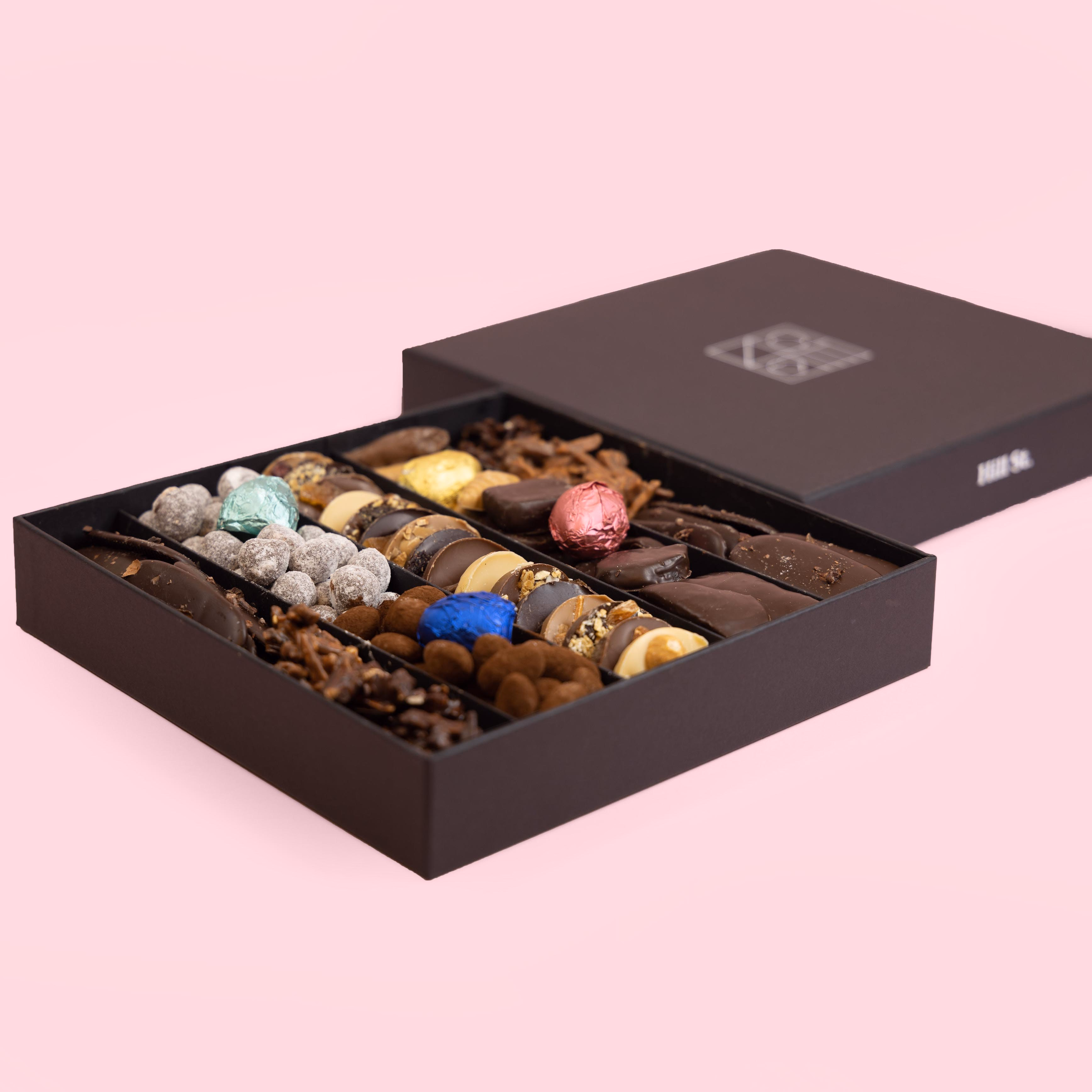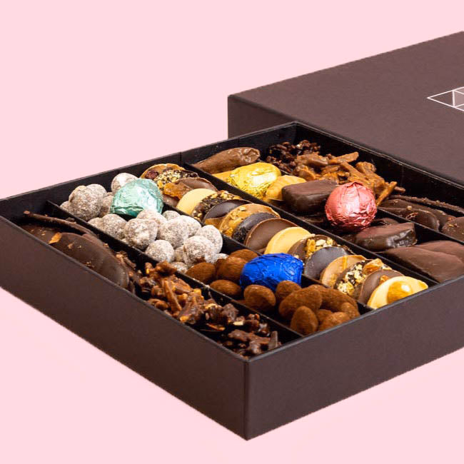 Whilst the images are a representation we will create delicious assortments depending on the production period, but rest assure we have an eye for detail and presentation of our chocolates is also at the forefront of what we do. These sections are packaged in a lovely black rigid box with a secure sleeve.