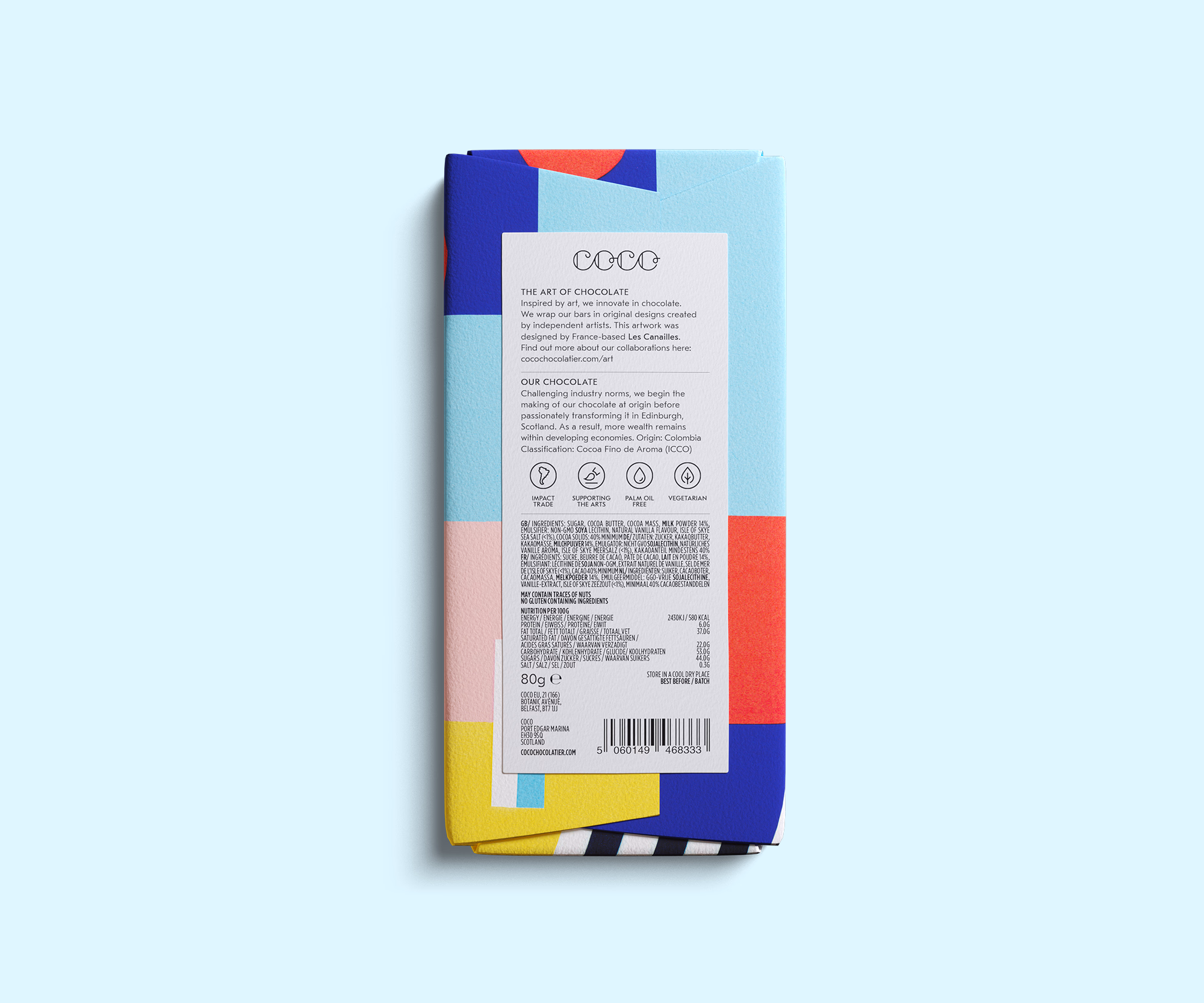 Ingredients: Sugar, Cocoa Butter, Cocoa Mass, Milk Powder, Emulsifier: Non-GMO Soya Lecithin, Natural Vanilla Flavour, Isle of Skye Sea Salt (<1%).