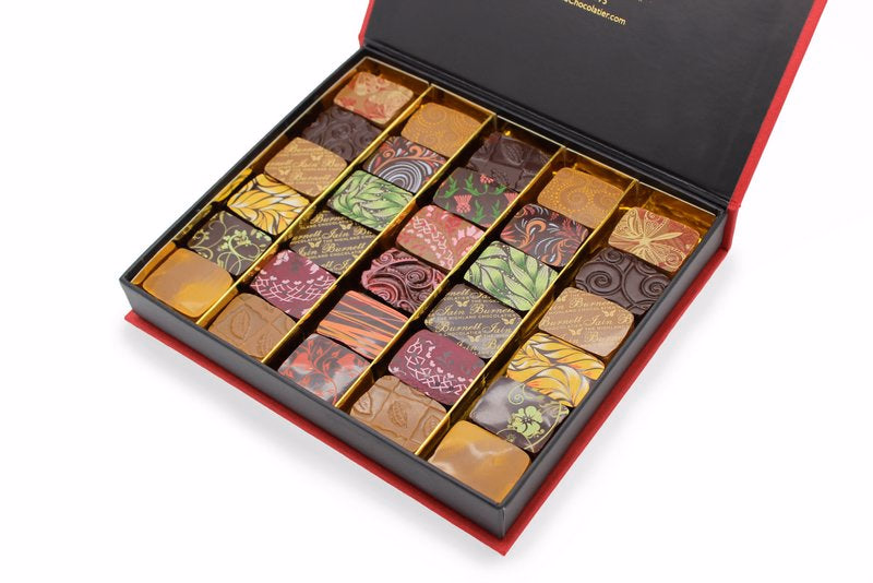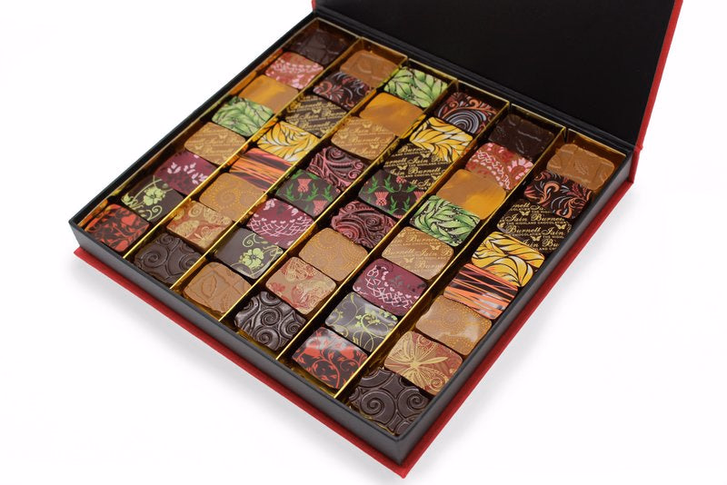 A curated collection of Iain Burnett's award winning Velvet Truffles, made with fresh local cream, crushed fruit and natural spices. Each piece has been "enrobed" or delicately covered in a paper thin layer of either Iain's signature São Tomé single origin dark chocolate, or caramel-noted couverture milk chocolate before being decorated with a colourful cocoa-butter design.