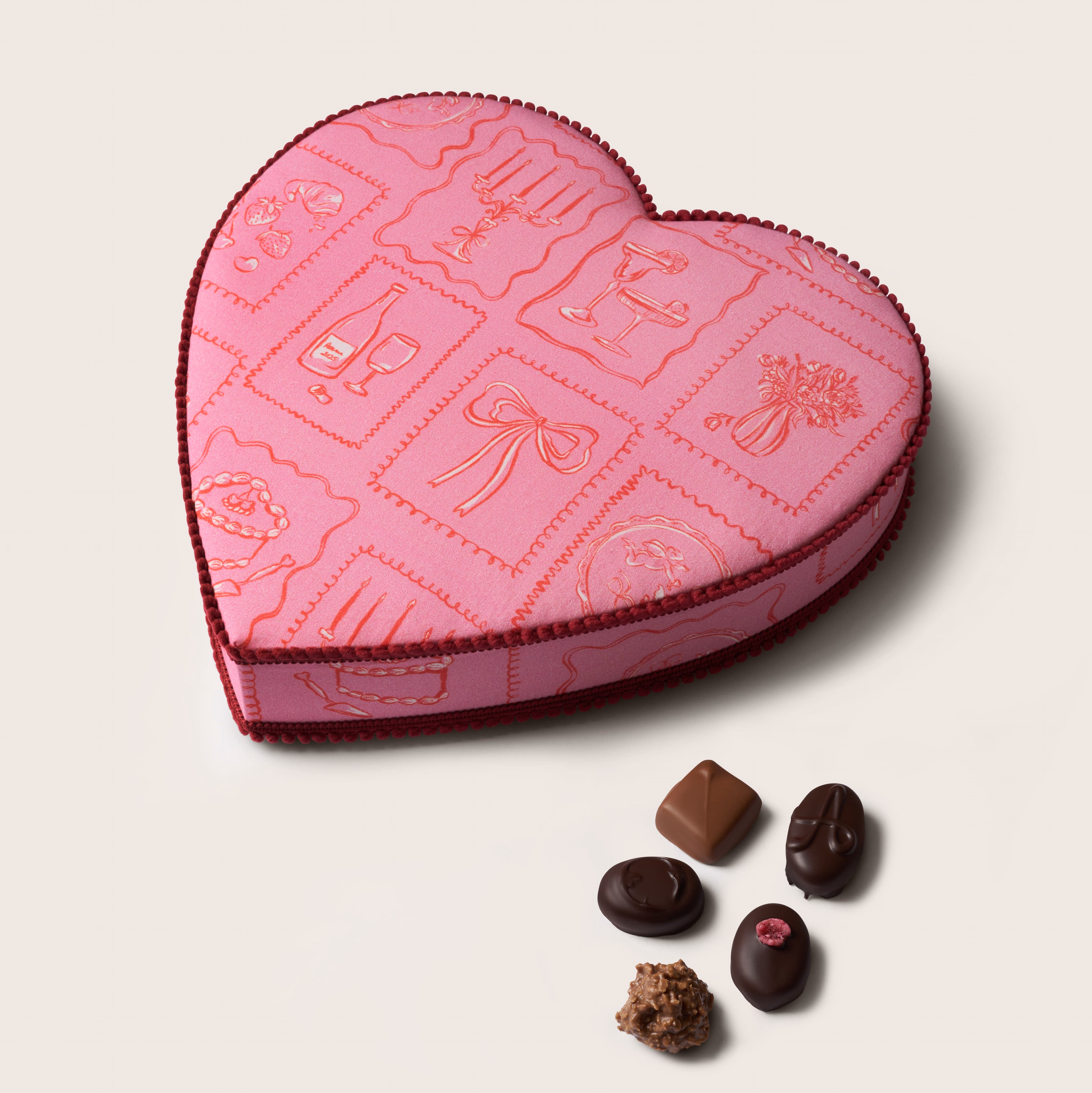 The ultimate Audrey's gift. A beautiful assortment of handmade chocolates, packed in a handmade heart material hat box. The material is sources from dead-stock and the box is made to last. The boxes are made in Devon and our chocolates made & packed in Hove. The box includes a selection of milk & dark handmade chocolates including; fondants, caramels, nougats, nuts and marzipans, all enrobed in milk & dark chocolate.