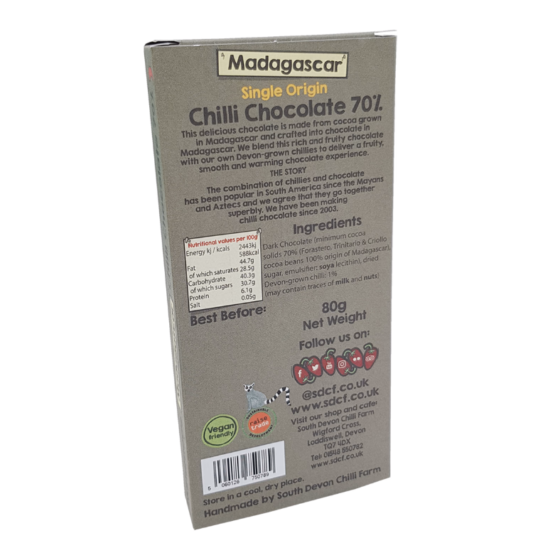 Single origin, 70% cocoa chocolate; our Madagascar 70% dark chilli chocolate delivers a fruity, smooth and warming chocolate experience.