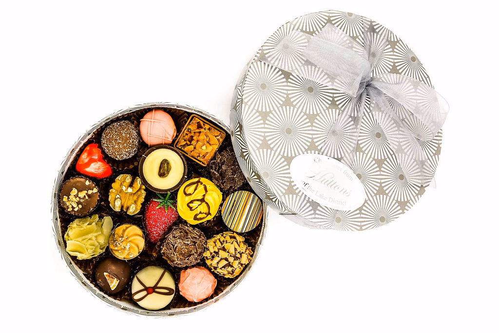 A luxury assortment chocolate box contains a selection of approximately 18 hand made truffles, creams and praline. Presented in a keep sake ribboned round box