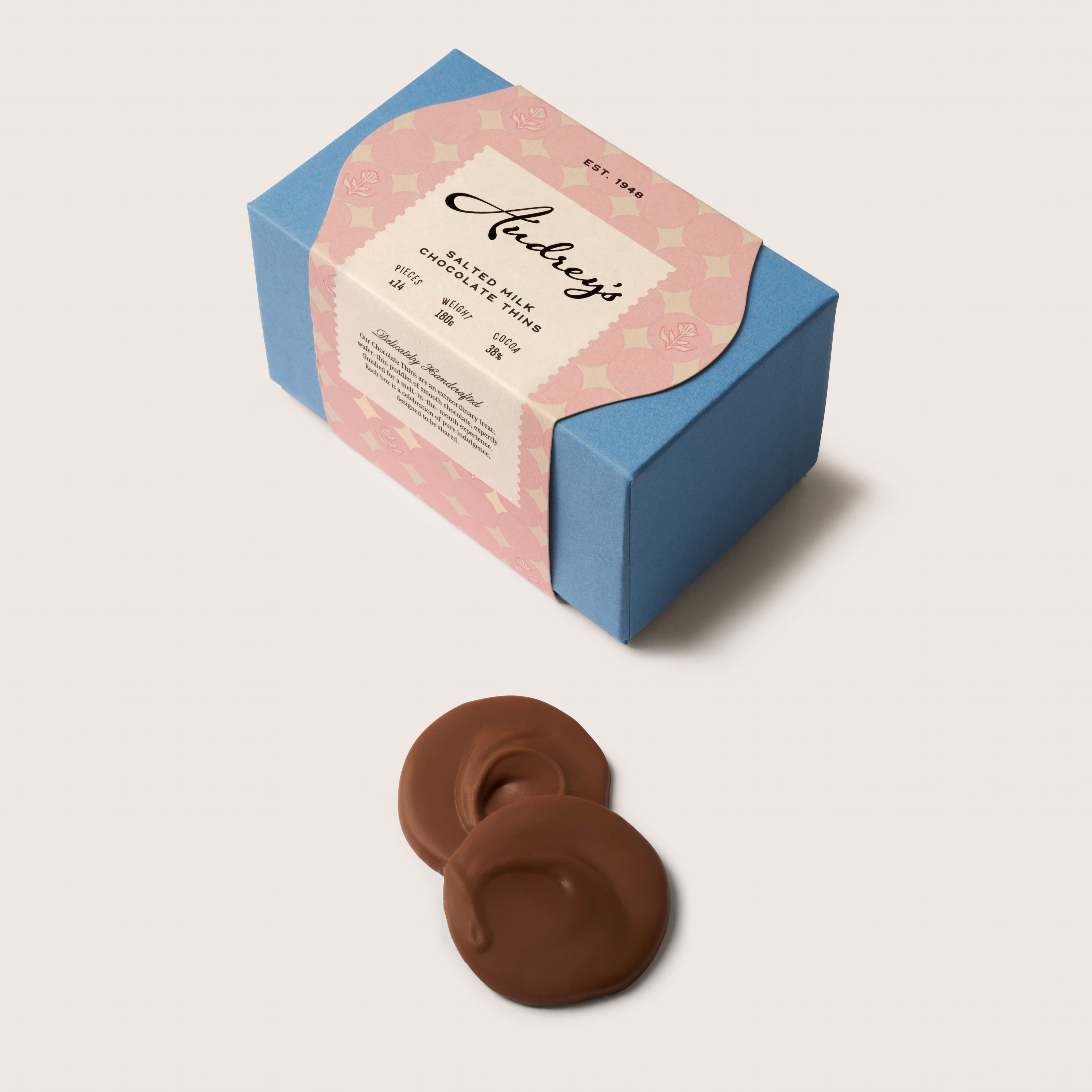 14 delicate handmade puddles of creamy Valrhona 38% milk chocolate, gently finished with smoked sea salt. Each thin melts effortlessly on the tongue, offering a perfect balance of sweet, smooth chocolate and savoury lift.