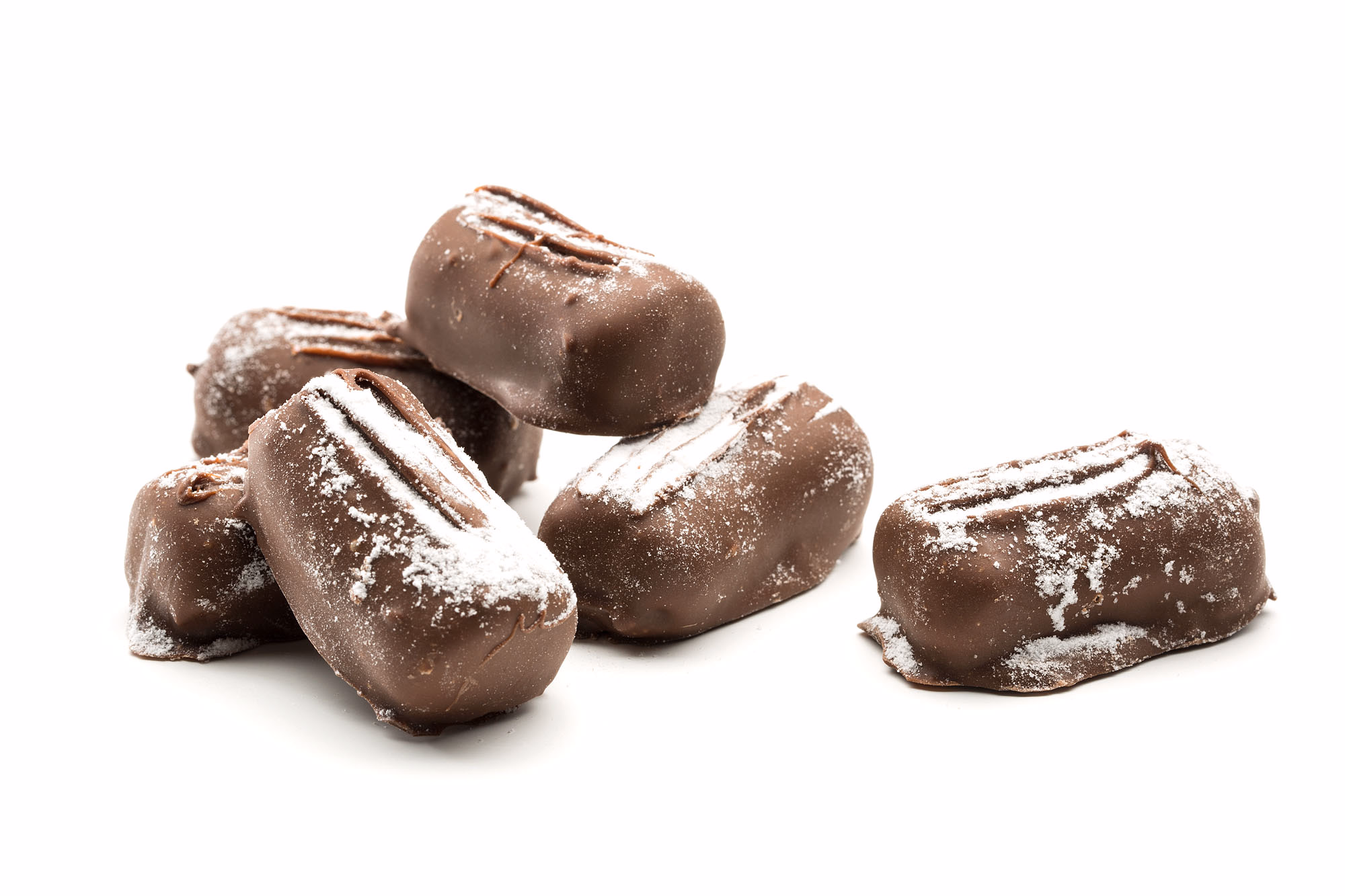 Huttons Exclusive Milk Chocolate Alpini, rich praline centre with crunchy hazelnut pieces generously hand dipped in creamy milk chocolate and dusted with icing sugar
