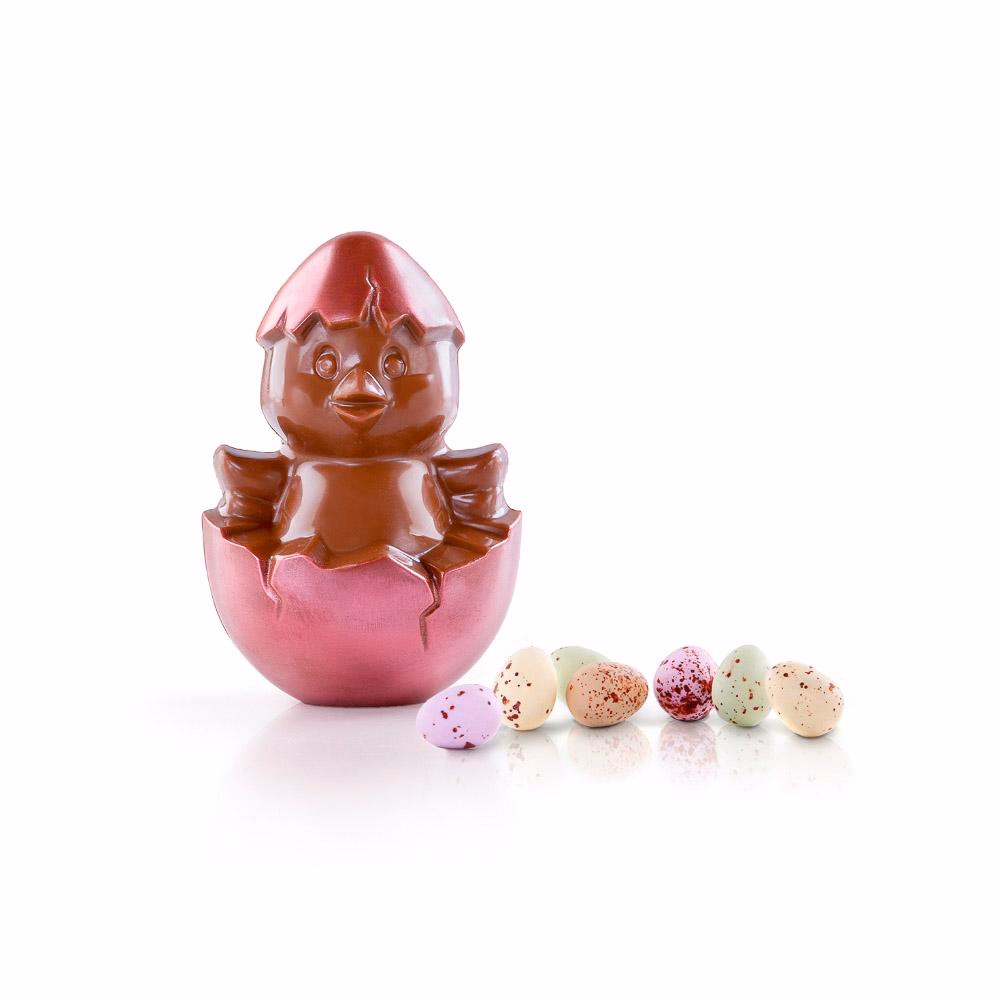 A sweet-faced Easter chick made with couverture milk chocolate with natural notes of caramel, hand-dusted in pink and perched on a nest of milk chocolate mini eggs. Presented in a clear bag and tied with ribbon.