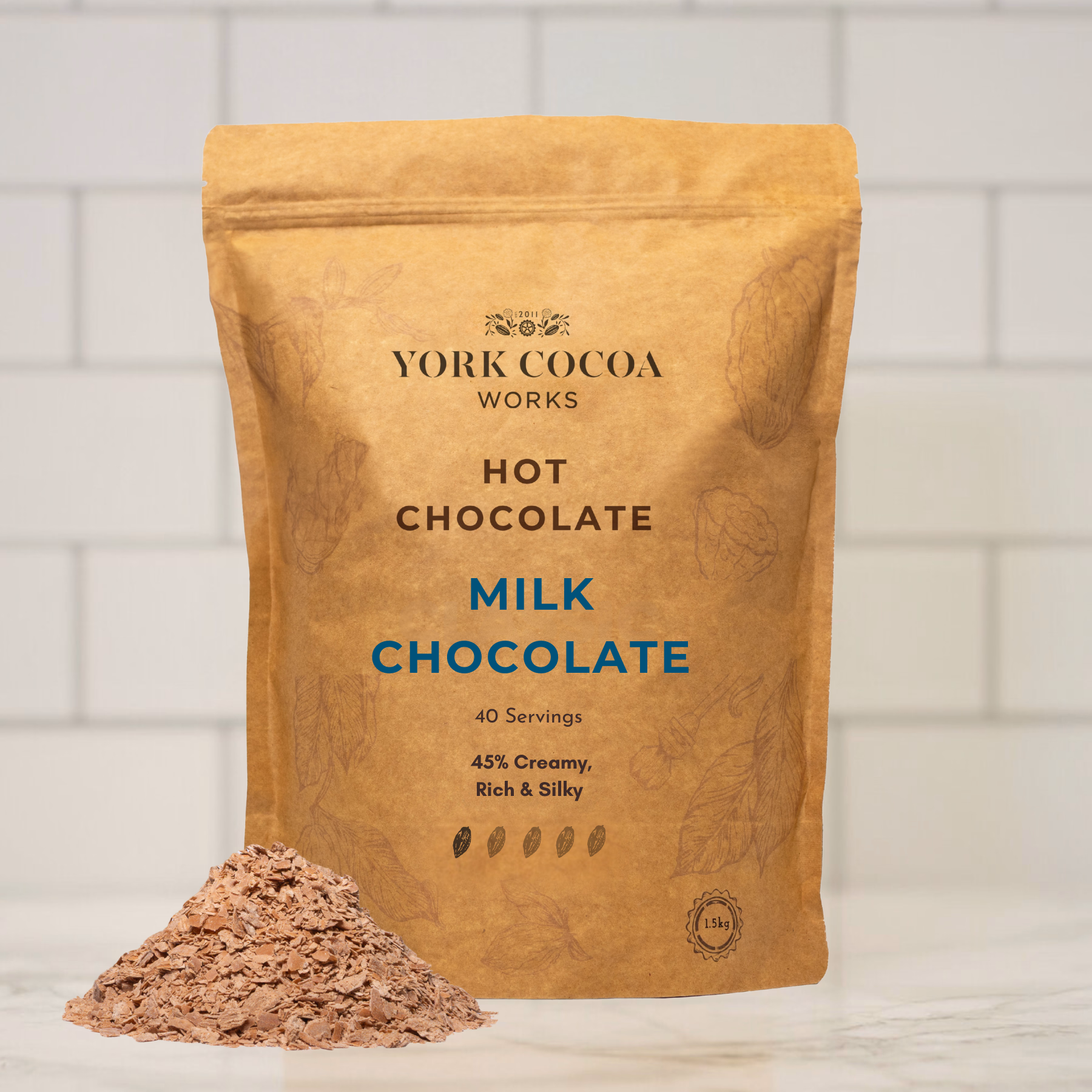 Our Milk Chocolate Hot Chocolate flakes are a Velvety Milk Chocolate handcrafted at our Chocolate Manufactory York Cocoa Works using our cocoa beans combined together with a rich whole cream milk powder and Madagascan Bourbon Vanilla to give a rich, velvety balance.