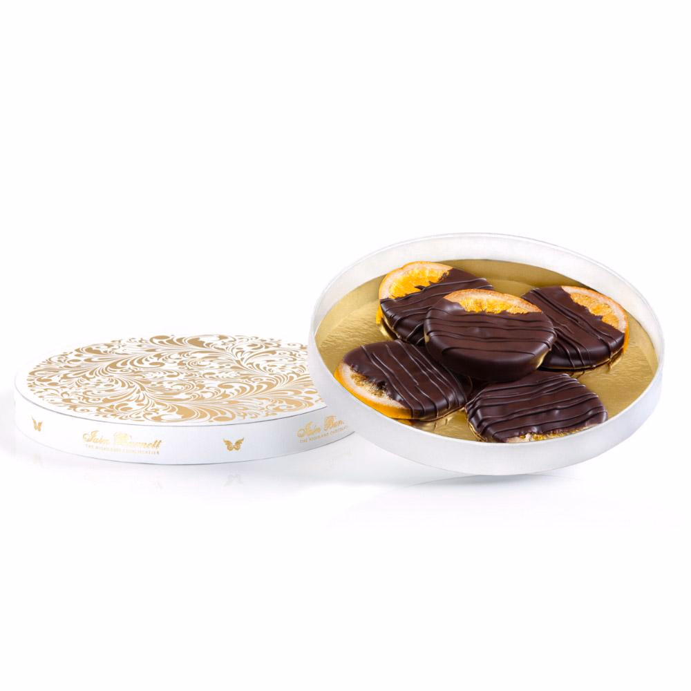 Slices of juicy orange, gently candied over days to slowly seal in the natural juice and flavour before being hand-dipped and decorated in São Tomé single origin dark chocolate. Presented in a luxurious white and gold-foil embossed box, perfect for a special gift.