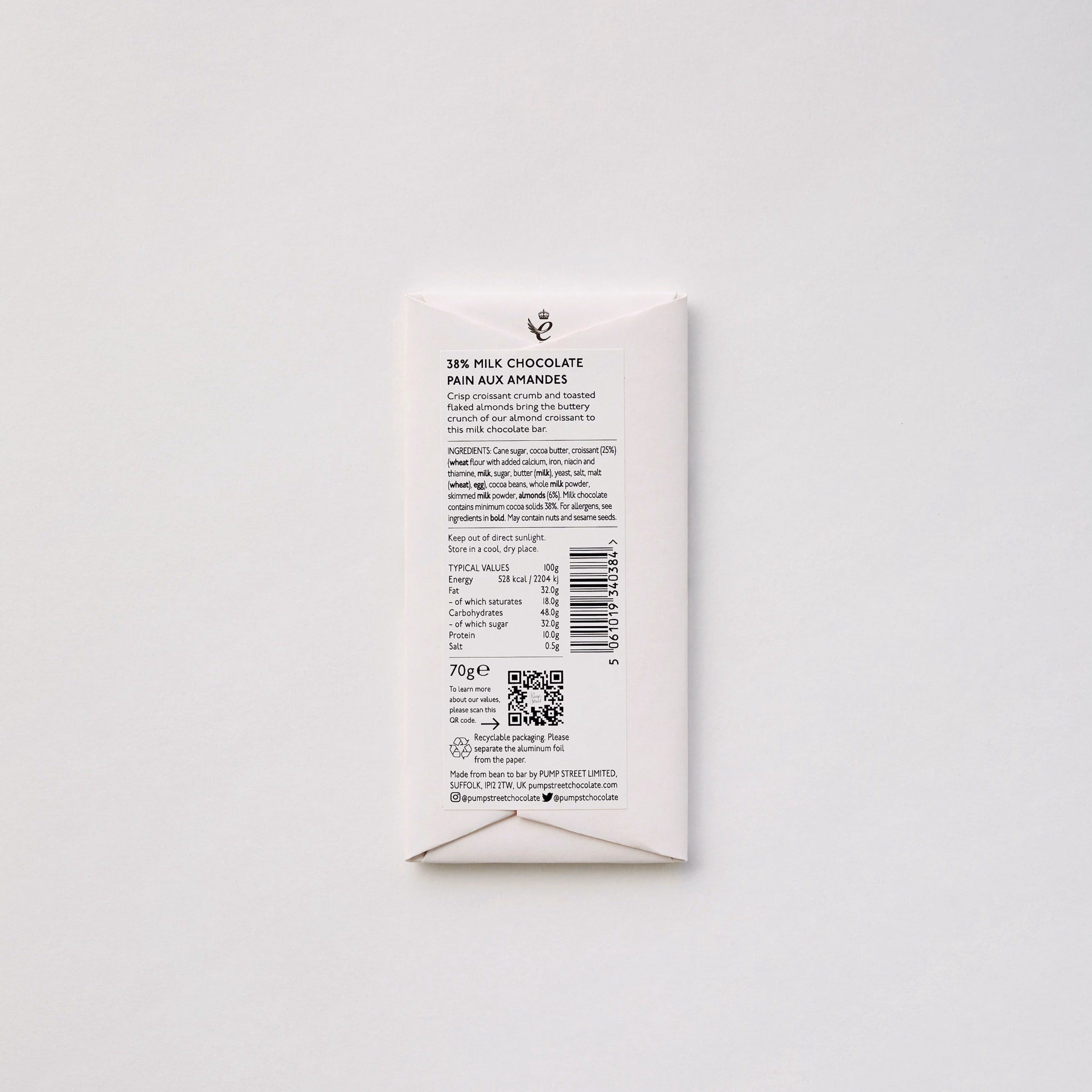 The flavours of one of our bakery classics - the Almond Croissant - shine in this bar; crisp croissant crumb and toasted flaked almonds with a buttery crunch. It is made with milk chocolate that we make from bean to bar with beans from the women-run Kekeli Cooperative in Togo. To this, we add croissant crumb which is ground into the base chocolate and then add ground toasted flaked almonds.