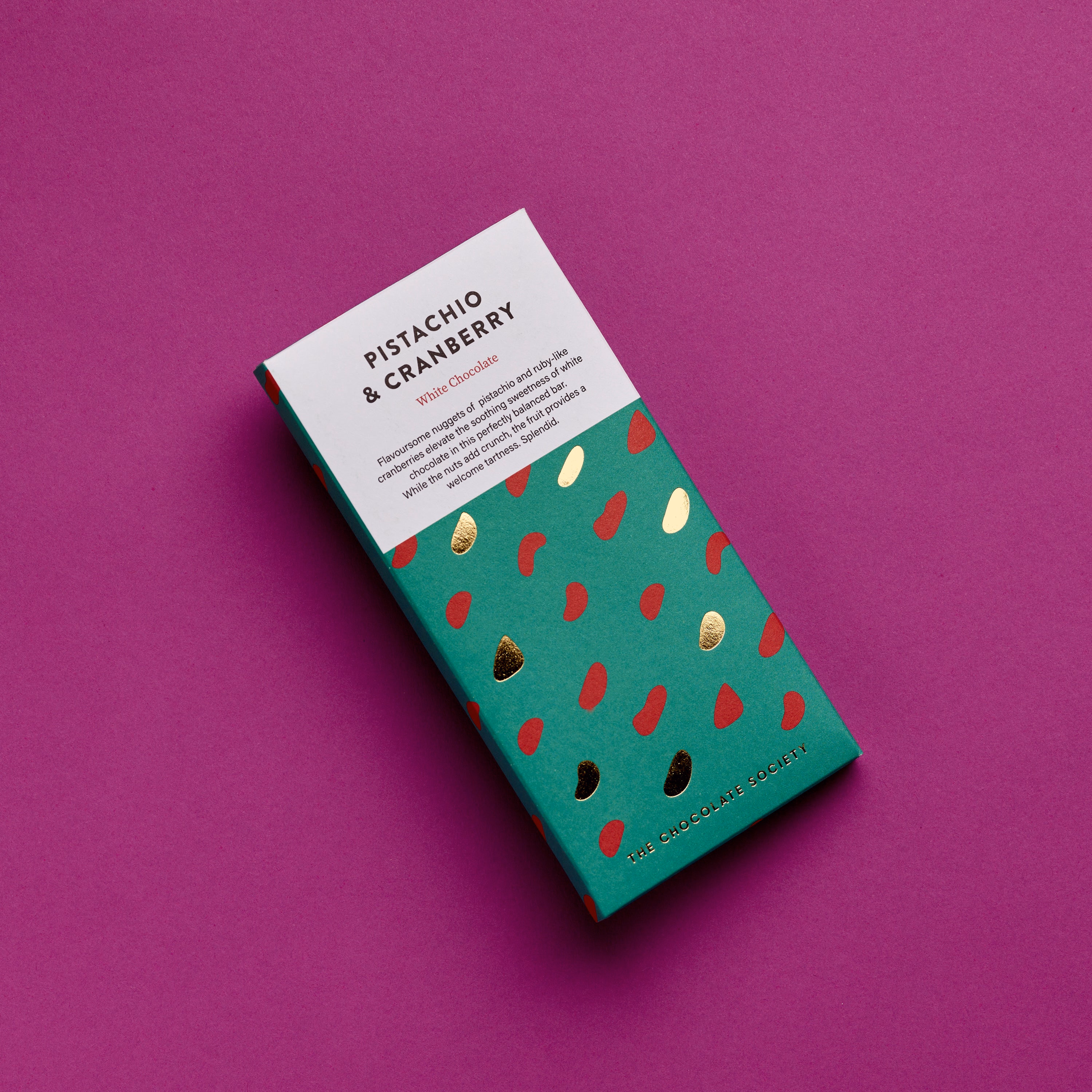 Flavoursome nuggets of pistachio and ruby-like cranberries elevate the soothing sweetness of white chocolate in this perfectly balanced bar. While the nuts add crunch, the fruit provides a welcome tartness. Splendid.
