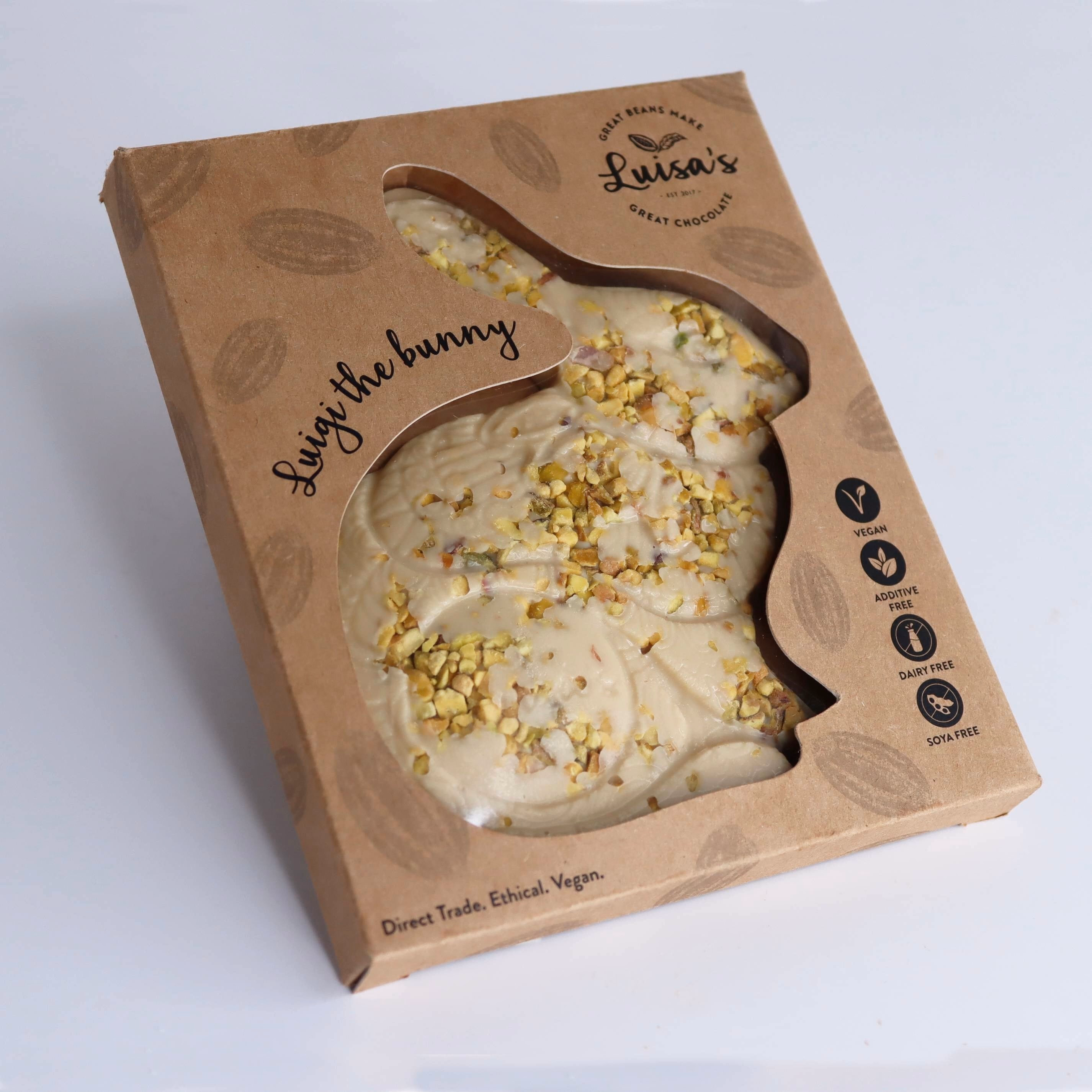 Our handcrafted artisan Luigi Bunny features a beautifully intricate design and is made with craftsmanship, quality, and ethics at its heart. This generous slab of luxurious chocolate makes a truly special Easter gift. Now in biodegradable packaging made from sea kelp.