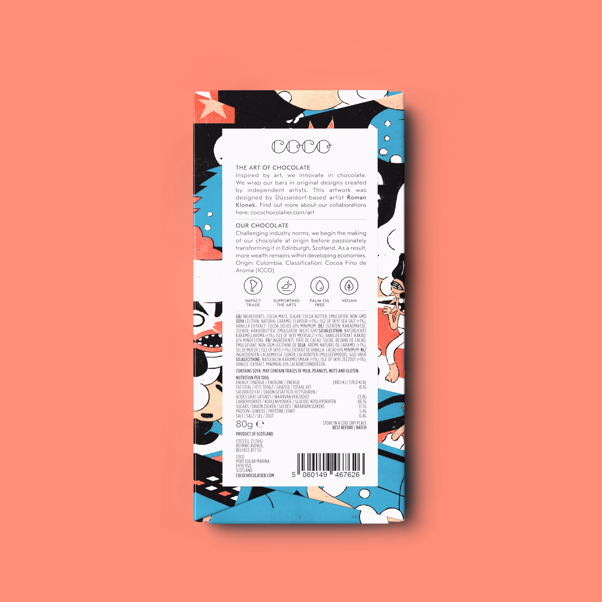 Ingredients: Cocoa Mass (44%), Sugar (38%), Cocoa Butter (17%), Emulsifier: Non-GMO Soya Lecithin (<1%), Isle of Skye Sea Salt (<1%), Natural Caramel Flavour (<1%), Vanilla Extract (<1%).
