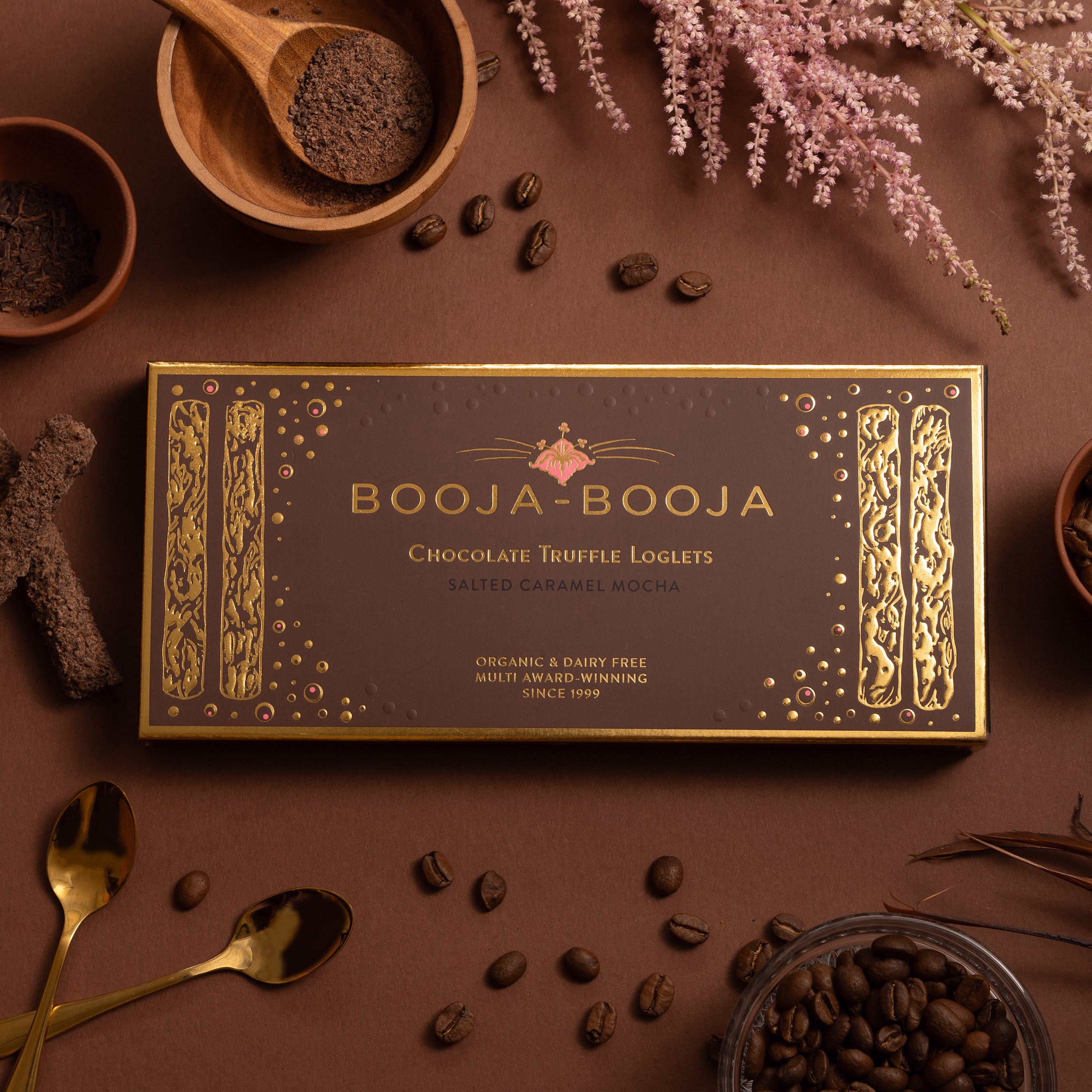 Ten especially long melt-in-the-mouth chocolate truffle loglets rolled in rich chocolate flakes. Perfect for elegant nibbling. Mocha chocolate ganache mingled with salty little chews. 115g.