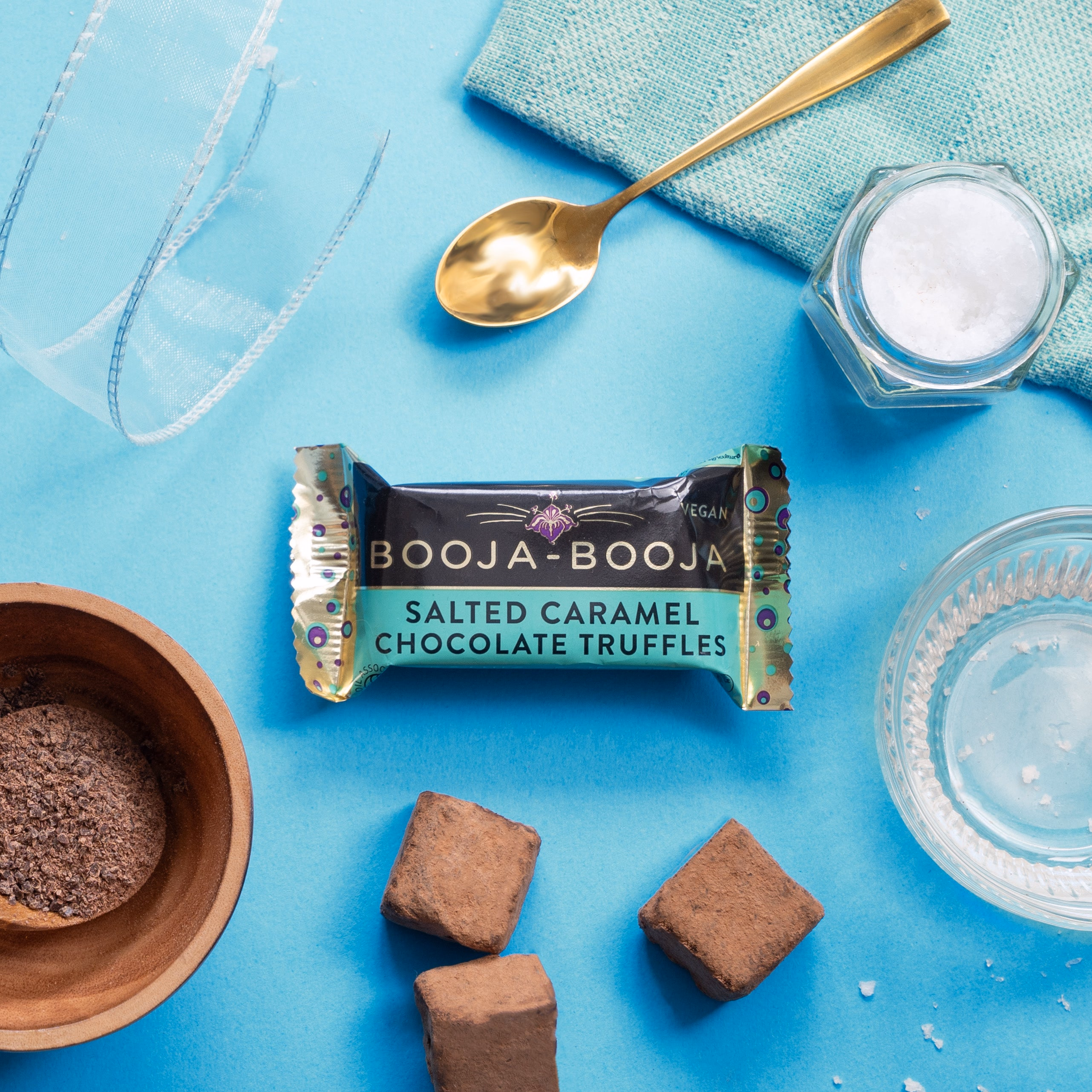 Two delicious chocolate salted caramel adventures. Sail the seas of salted chocolate and caramel chewiness. These melt-in-the-mouth chocolate truffles are created from simple, carefully chosen, vegan and organic ingredients. 23g.