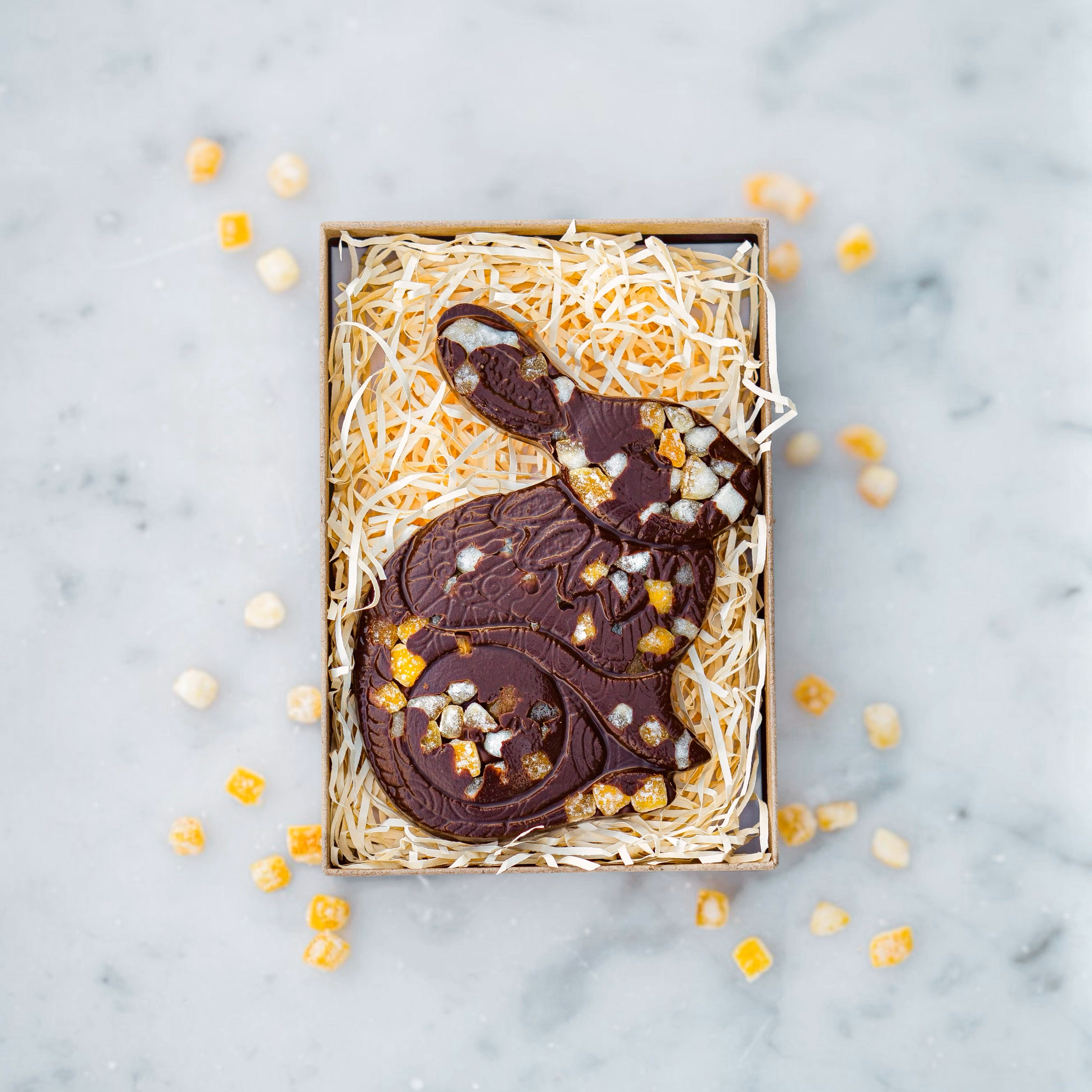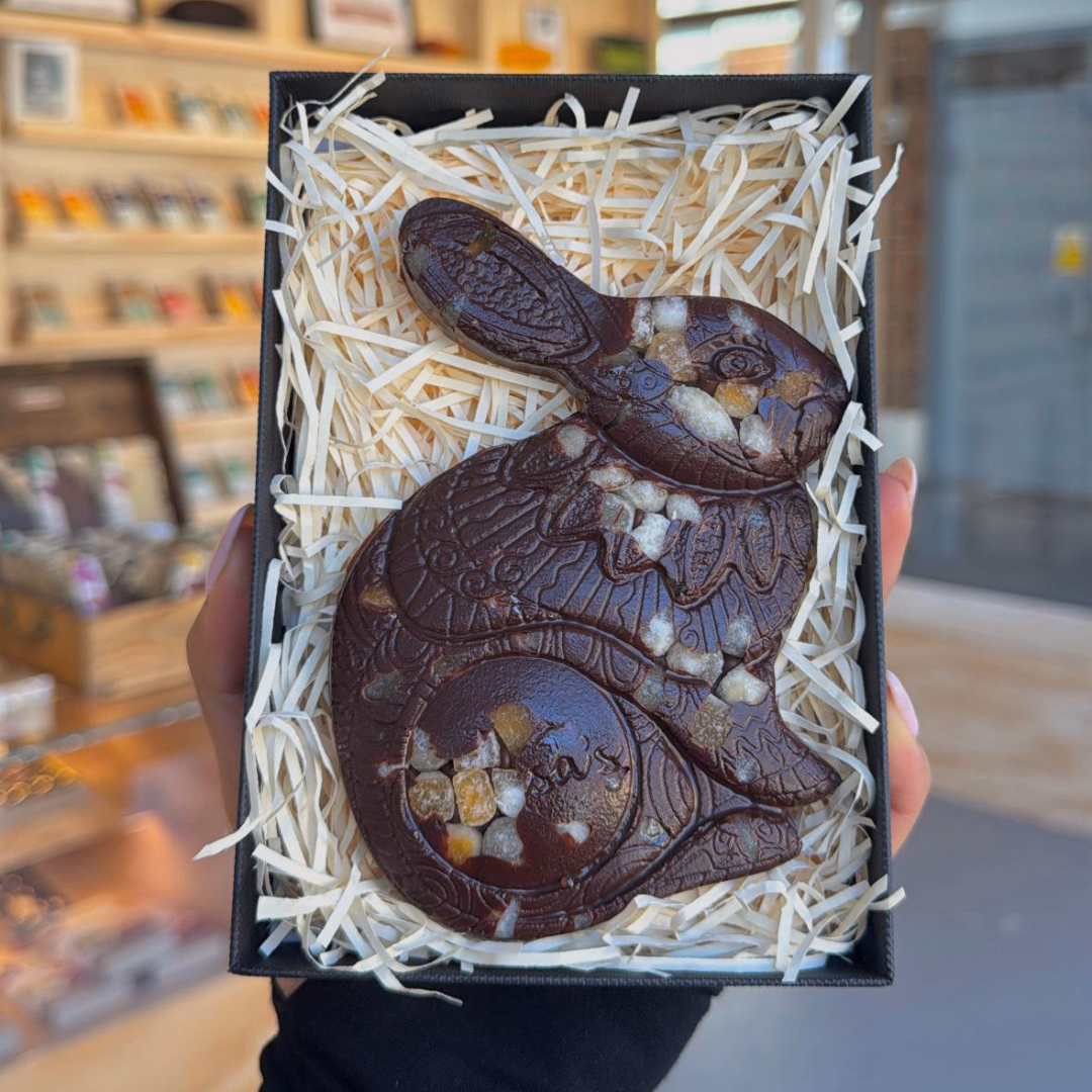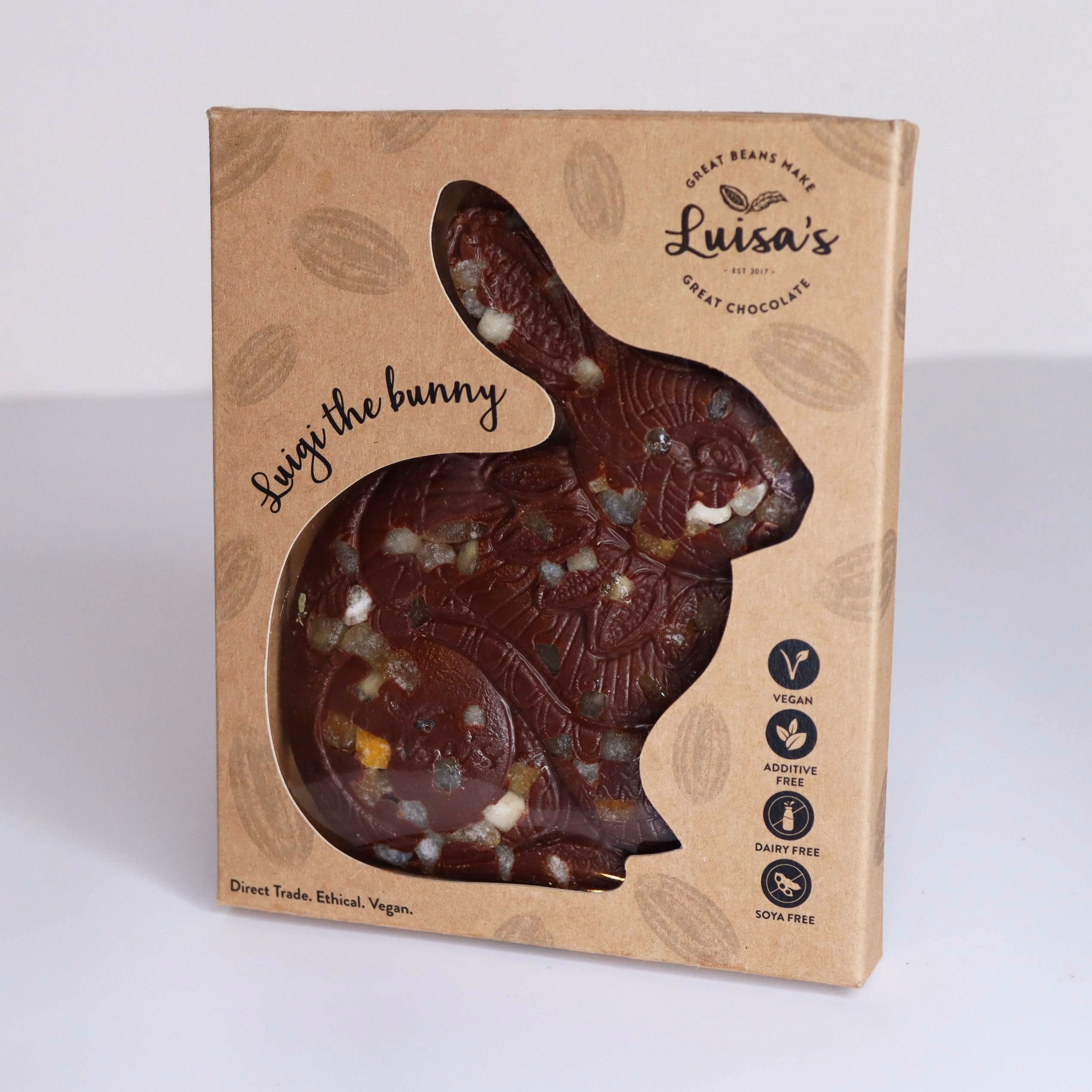 Our handcrafted Luigi Bunny features a beautifully intricate design and is made with craftsmanship, quality, and ethics at its heart. This generous slab of award-winning, luxurious chocolate makes a truly special Easter gift. Now in biodegradable packaging made from sea kelp.
