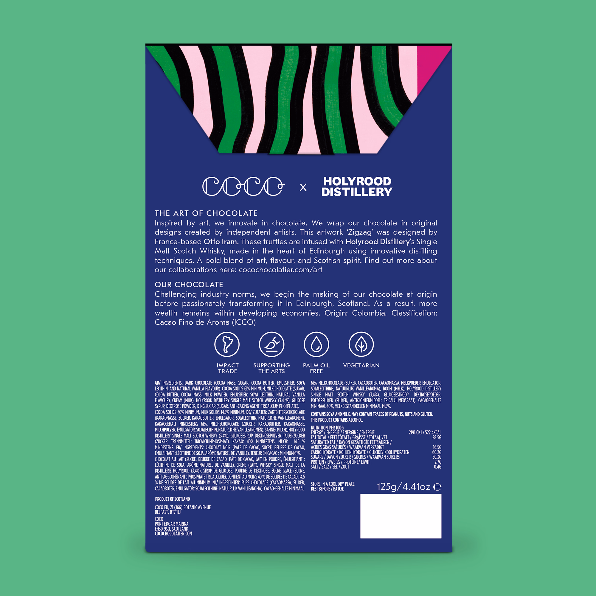 These exquisite whisky truffles blend our dark chocolate truffles with Holyrood Distillery’s finest Single Malt Scotch Whisky. Based in Edinburgh, Holyrood Distillery is dedicated to offering something unique with each release. Much like COCO, Holyrood Distillery challenges the status quo, always striving to do things differently. This collaboration combines COCO’s artistry with Holyrood Distillery’s expertise, knowledge, and experience.