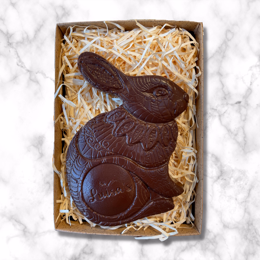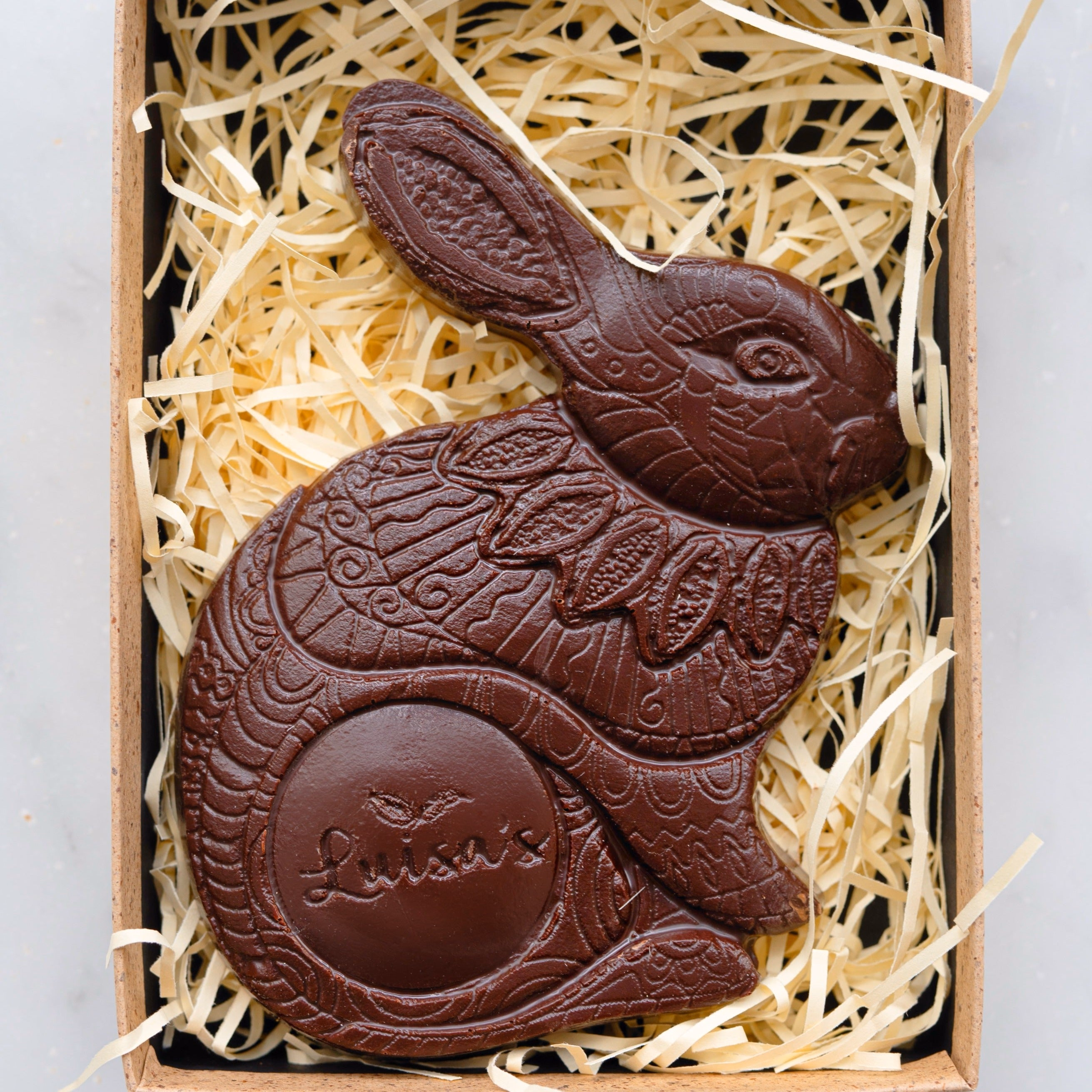 Each Luigi Bunny is handcrafted with a beautifully intricate design and made with craftsmanship, quality, and ethics at its heart. This generous slab of luxurious chocolate makes a thoughtful Easter gift - elegant, delicious, and full of character. Now in biodegradable packaging made from sea kelp.