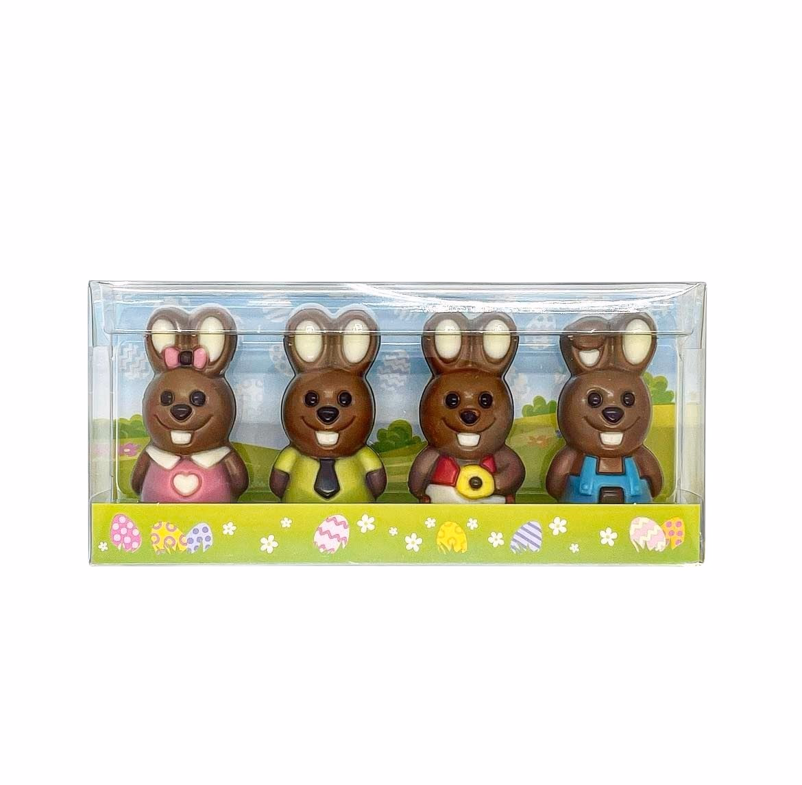 Four adorable mini decorated milk chocolate Easter bunnies, a gorgeous gift or addition to an Easter basket